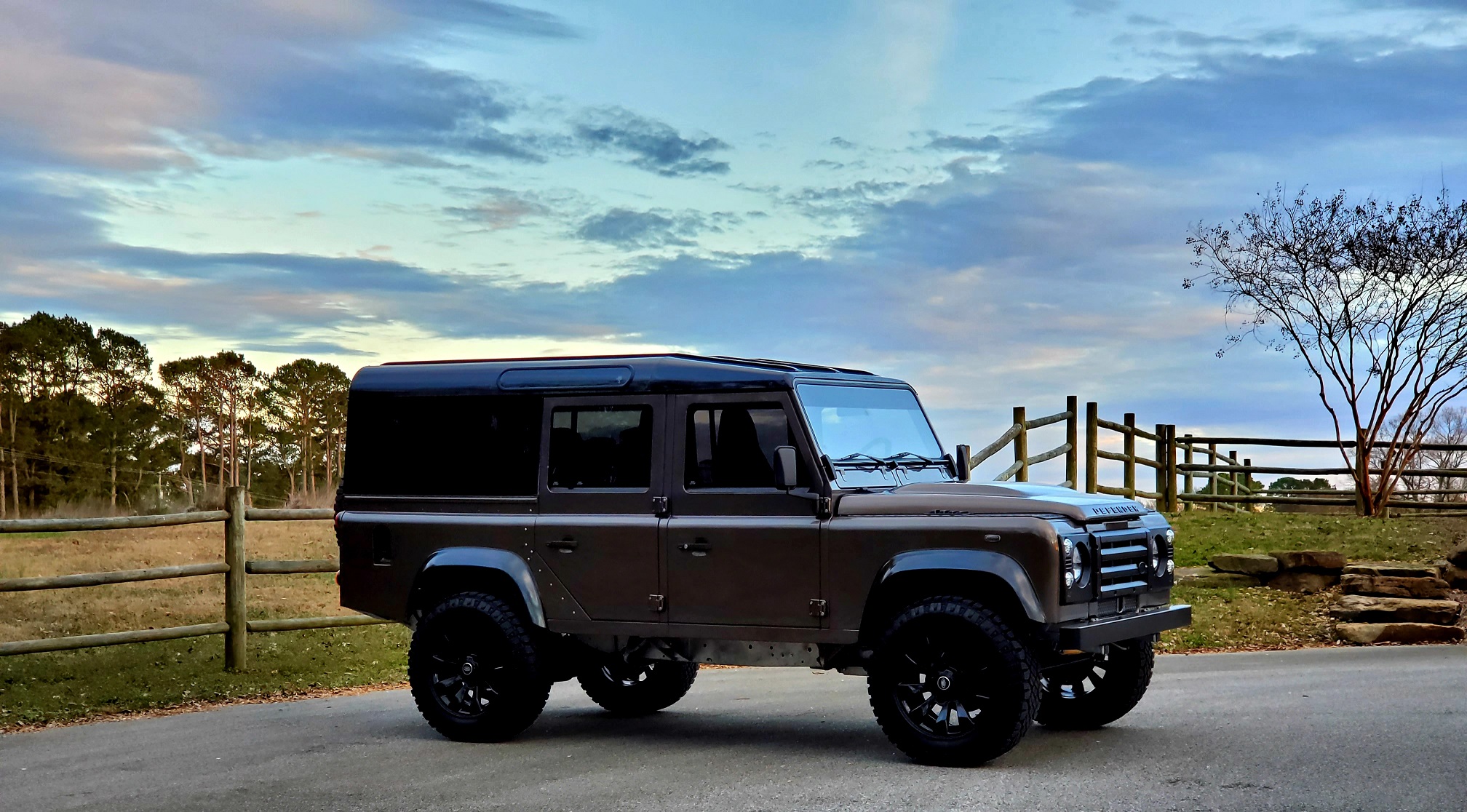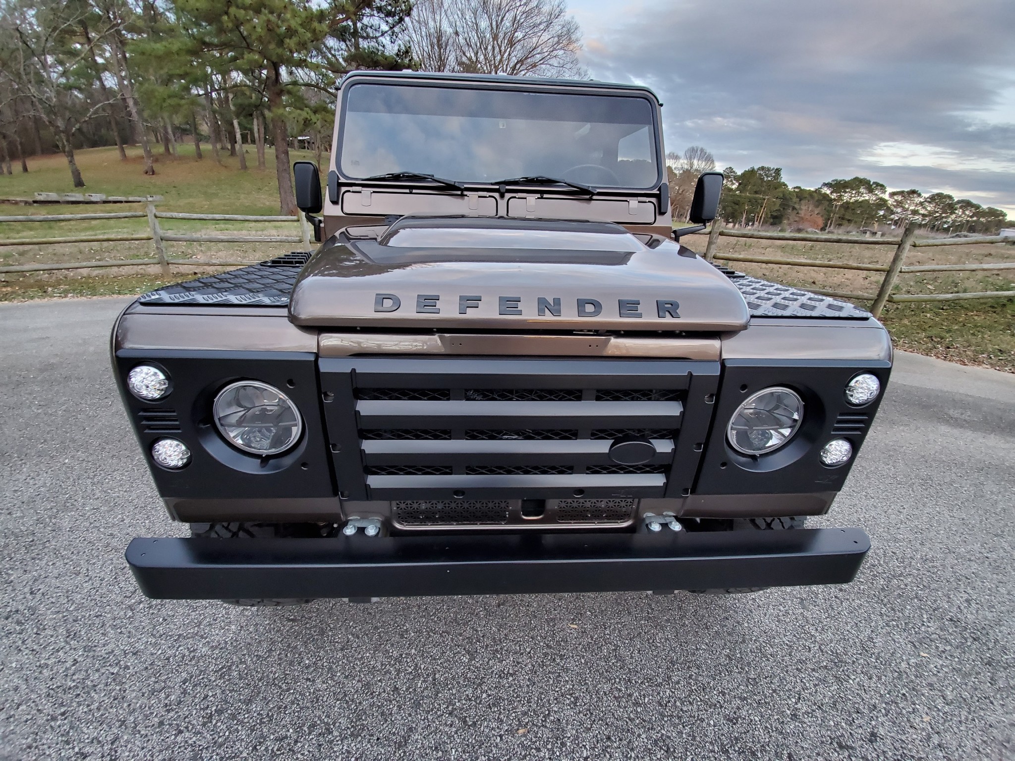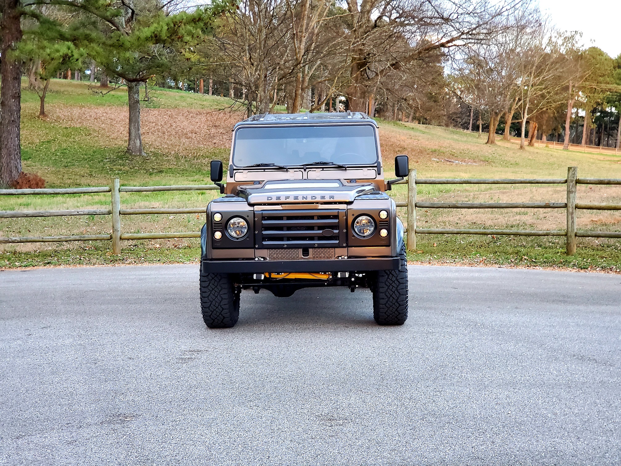 Black 18″ wheels wear Land Rover center caps and 275/65 Goodyear Wrangler Duratrac tires. Braking is handled by four-wheel discs with a replacement master cylinder, lines, calipers, and pads.