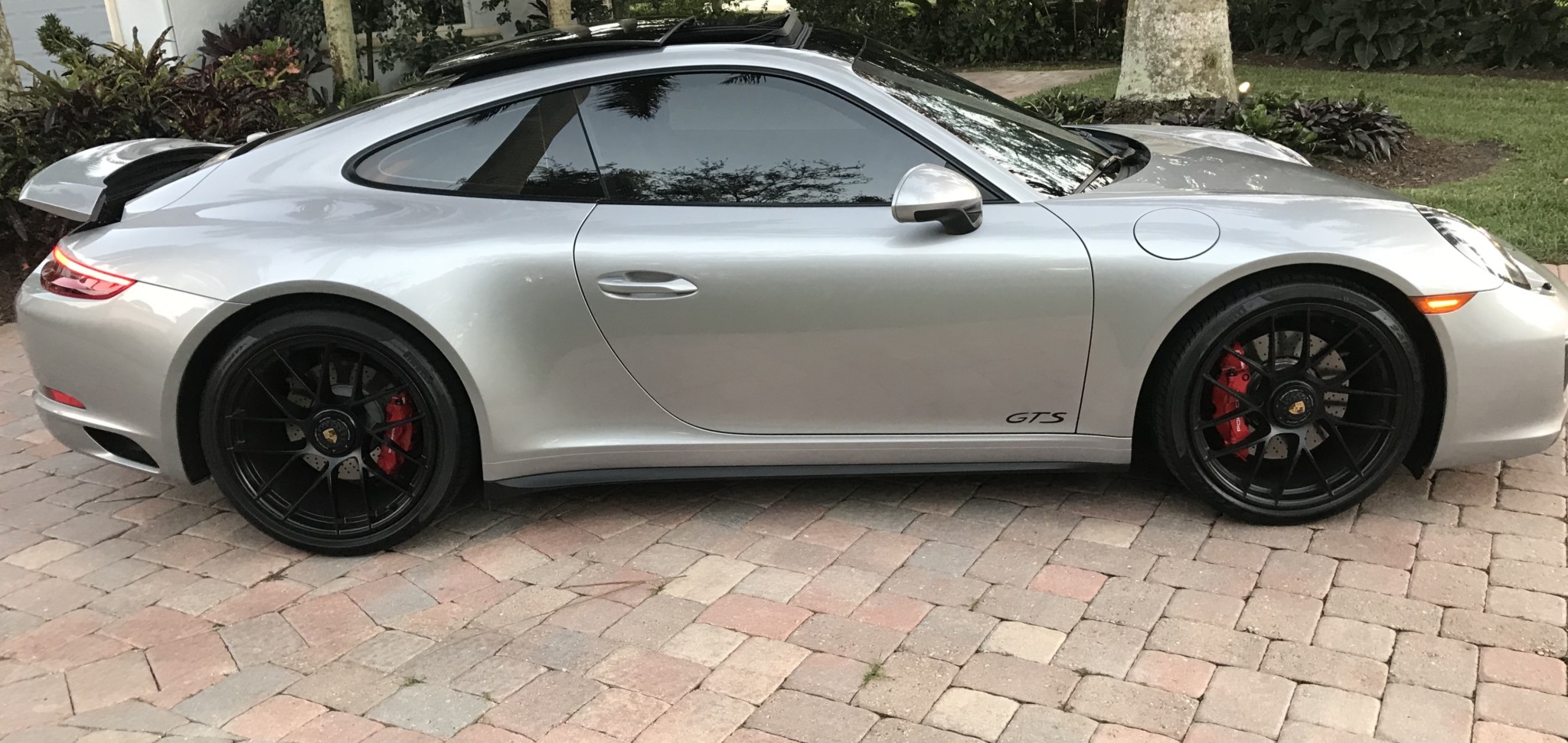 Factory 20″ Turbo S center-lock wheels wear 245/35 front and 305/30 rear Pirelli P Zero tires. GTS models feature red six-piston brake calipers in the front, four-piston calipers at the rear, and cross-drilled rotors all around.