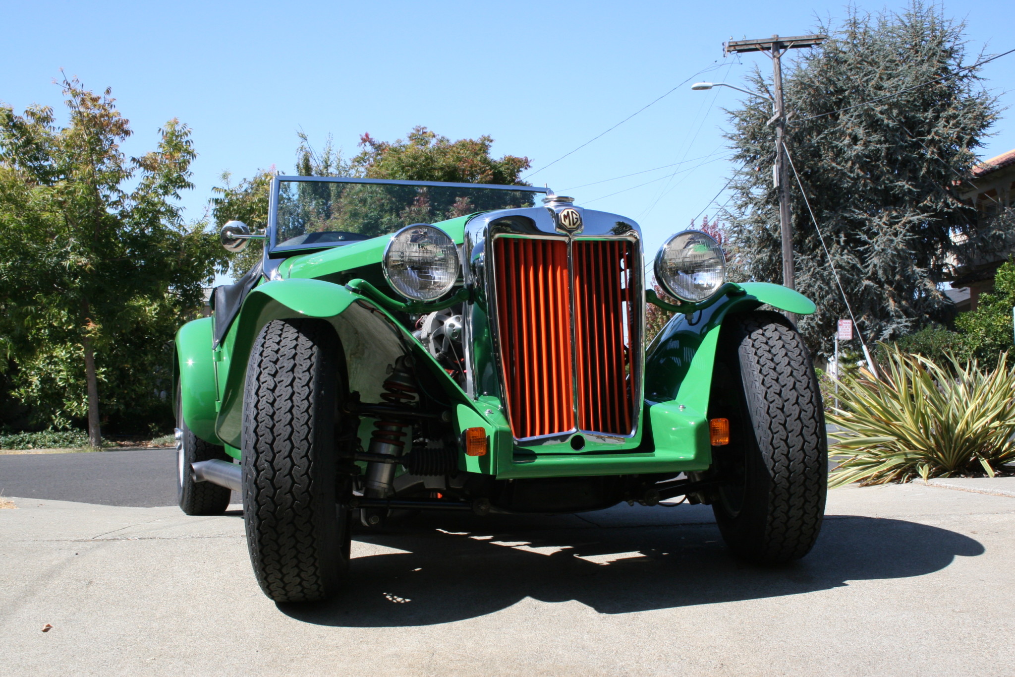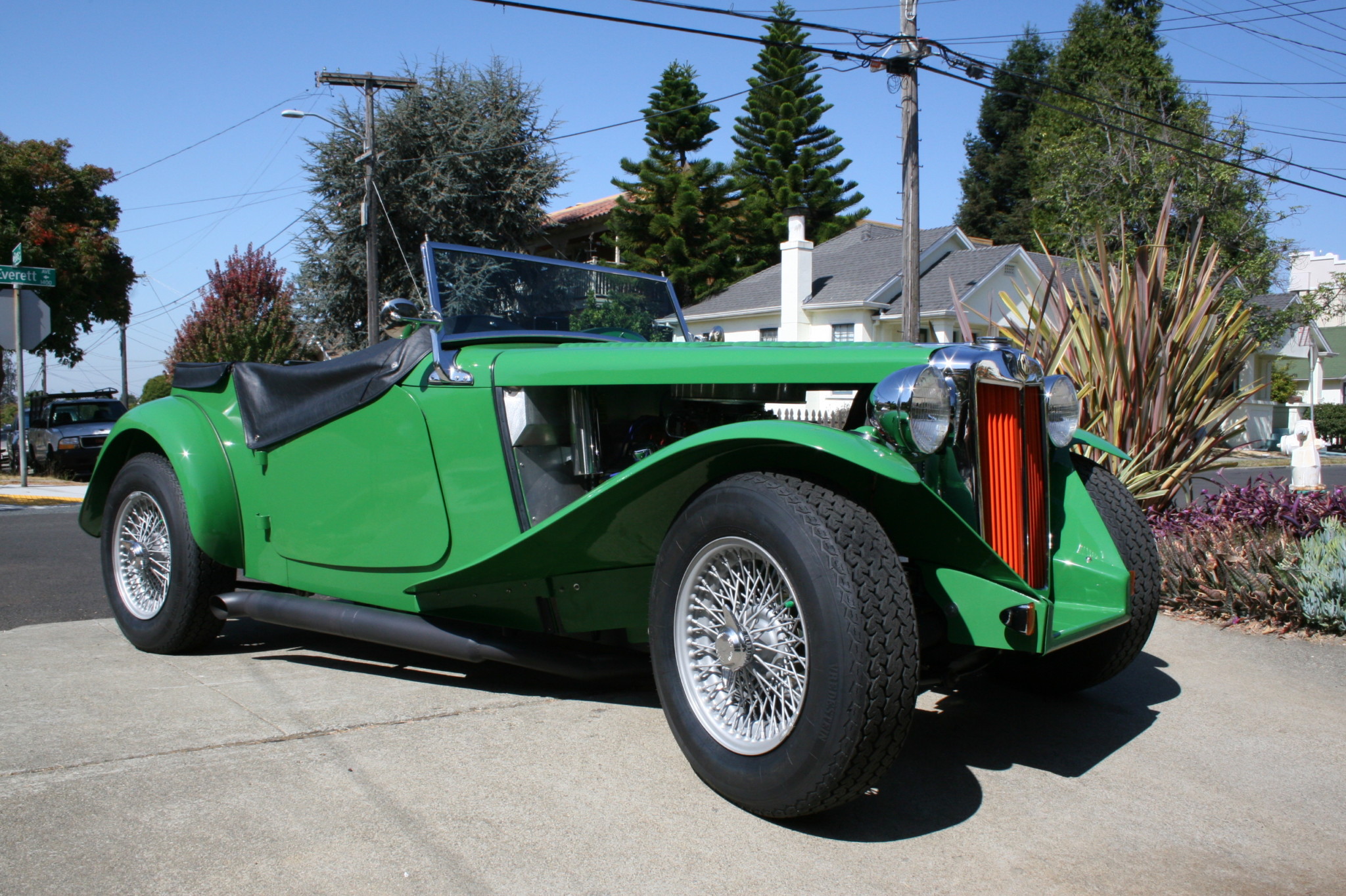 Painted 15″ 72-spoke knock-off wire wheels were reportedly fitted with Vredestein tires less than 2k miles ago. The custom four-link rear suspension setup is said to have been designed by Joe Casanova of San Jose, California to feature a Panhard rod, two extra crossmembers, and repositioned frame rails. Additional modifications include Aldan coilovers, custom tubular A-arms, an MGB steering rack, and Triumph TR6 wheel splines. Braking is handled by an MGB front disc setup with slotted and cross-drilled rotors, Ford rear drums, and Wilwood master cylinders.