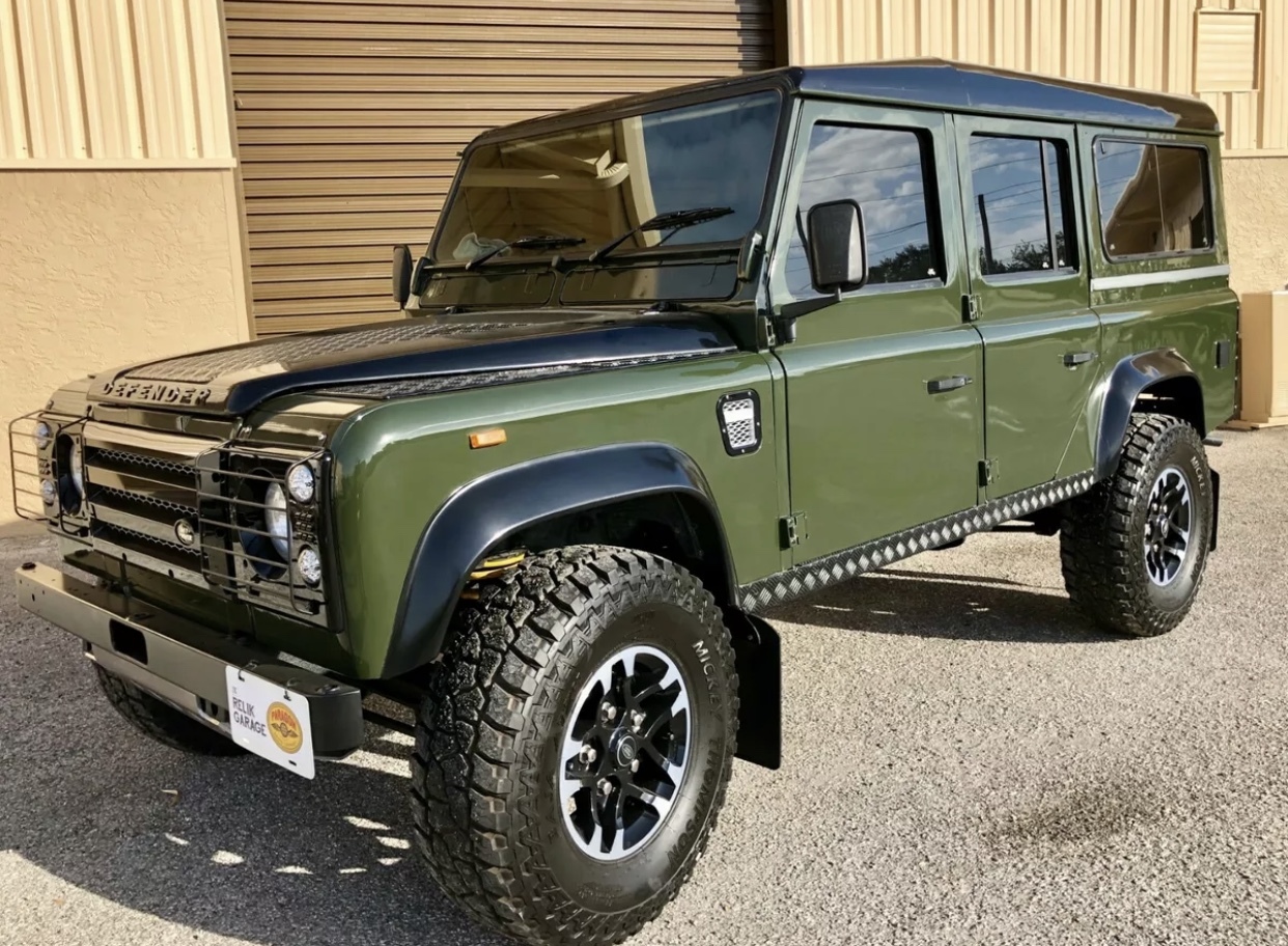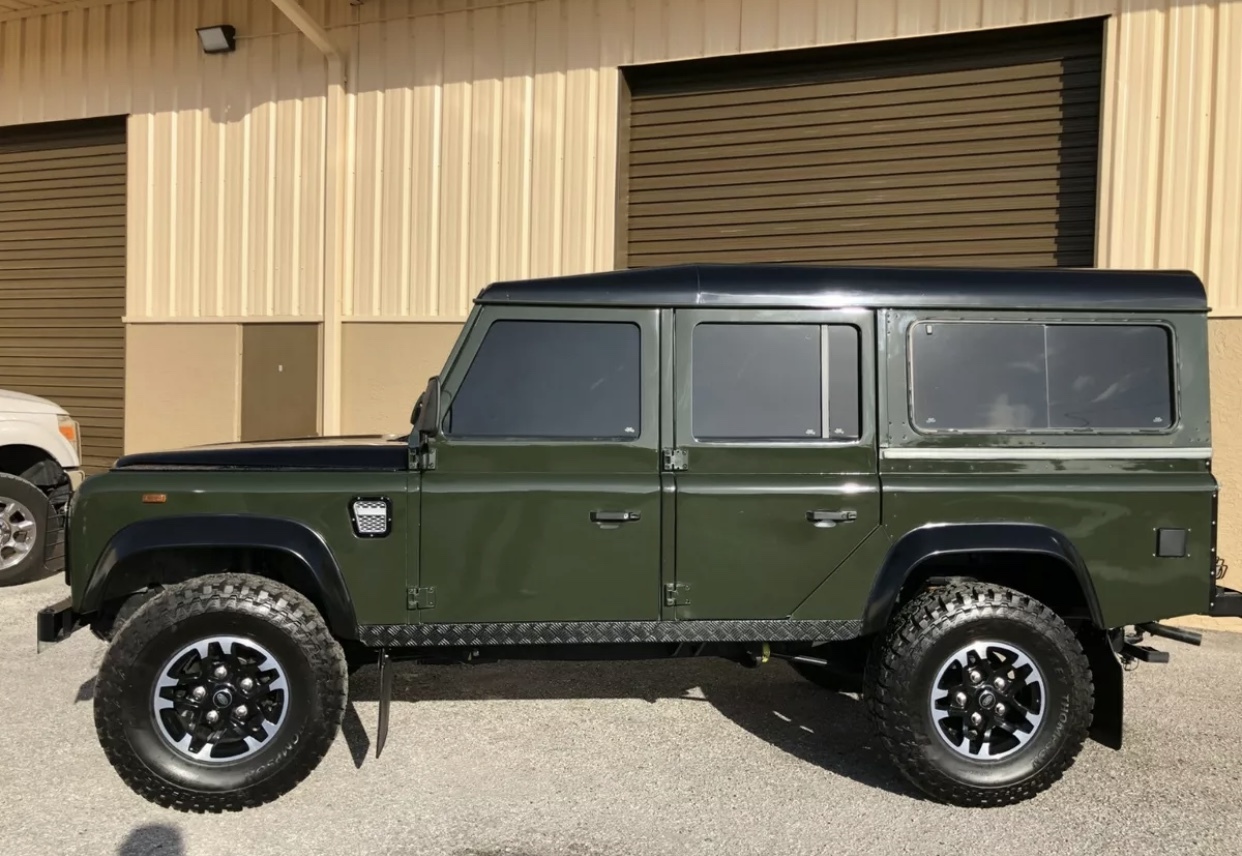 Black 16″ Land Rover XS wheels with machined faces are mounted with 285/75 Mickey Thompson Baja ATZ tires. New shock absorbers, coil springs, and tie rods have been installed according to the seller, and the braking system is said to benefit from a replacement booster, shoes, pads, and lines.