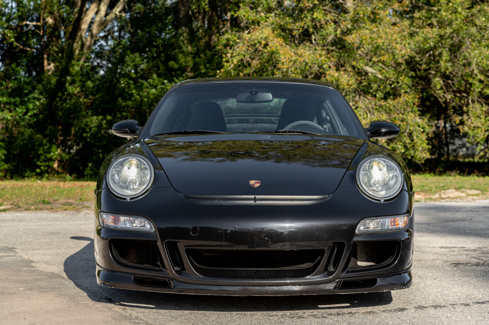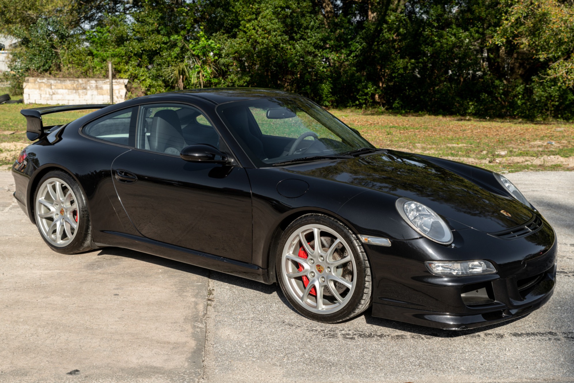 Silver 19” alloy wheels wear Michelin Pilot Sport Cup 2 tires measuring 235/35 up front and 305/30 at the rear. Standard equipment includes Porsche Active Suspension Management (PASM), traction control, red six- and four-piston calipers paired with cross-drilled rotors, and tire pressure monitoring. The seller dealer notes the rear tires are in need of replacement.