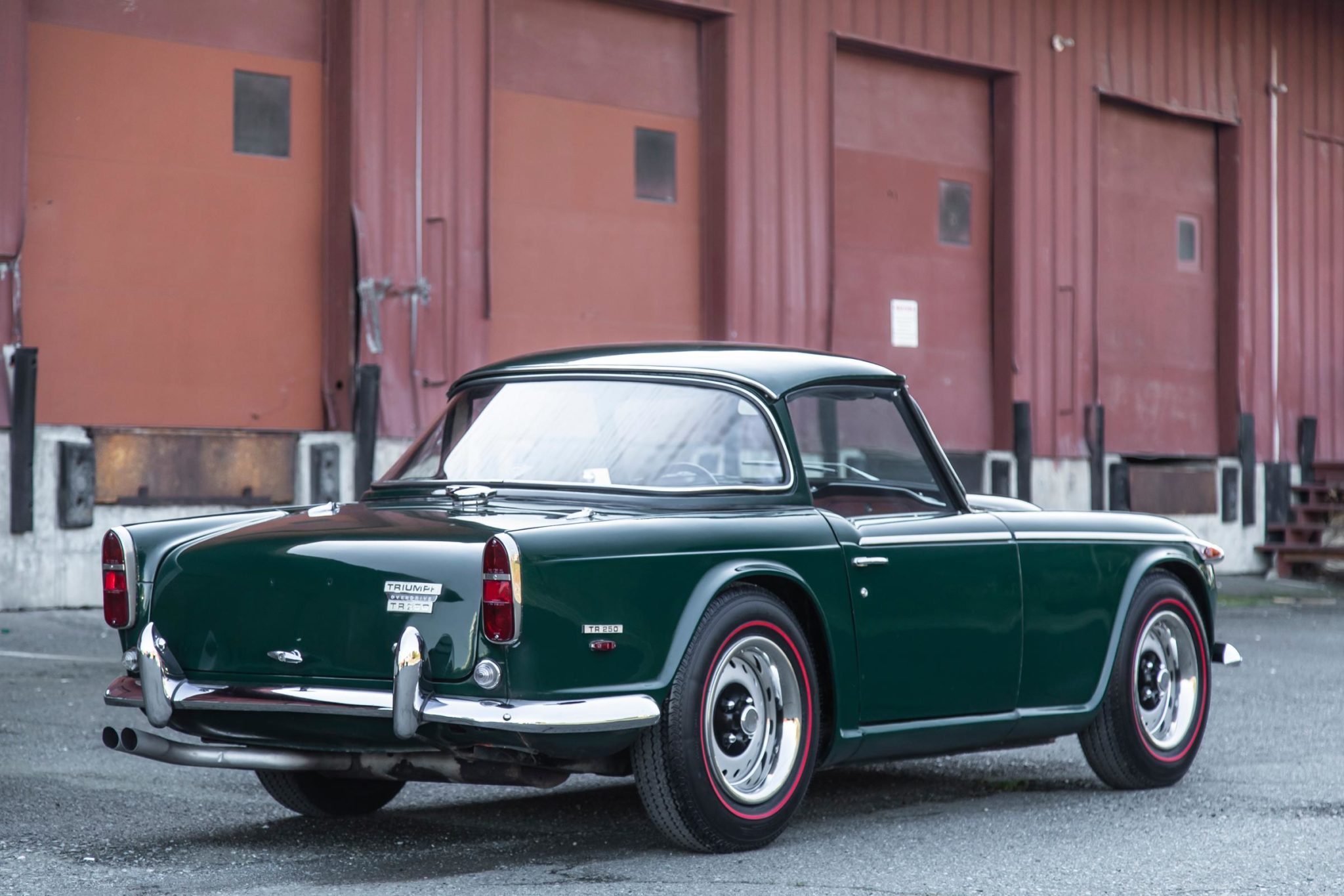 Triumph TR6 steel wheels are wrapped in 185R-15 Coker Classic redline tires which the selling dealer notes were installed in preparation for the sale.