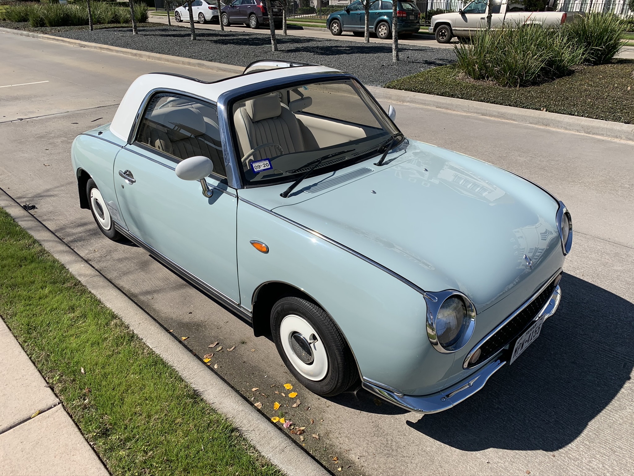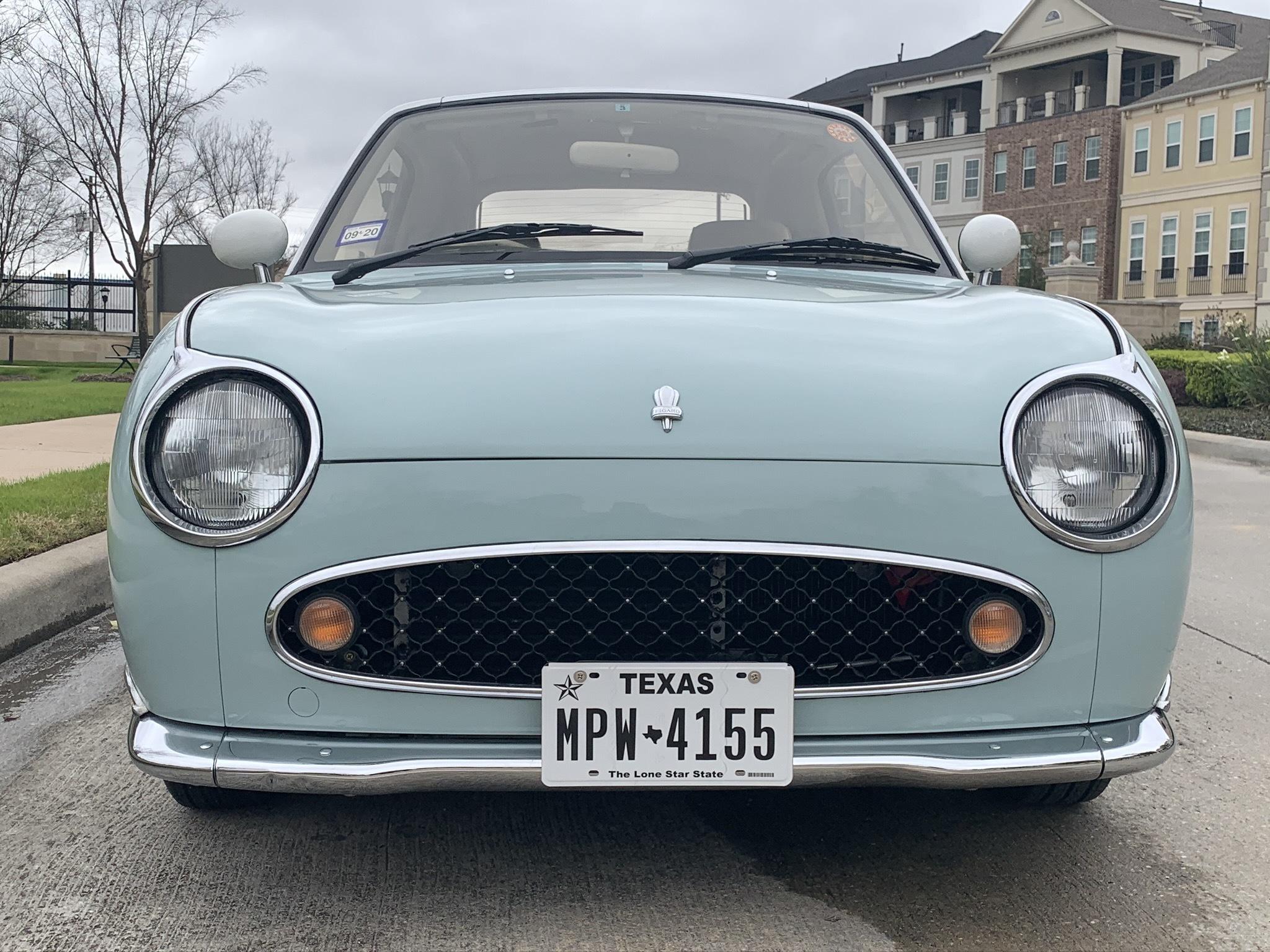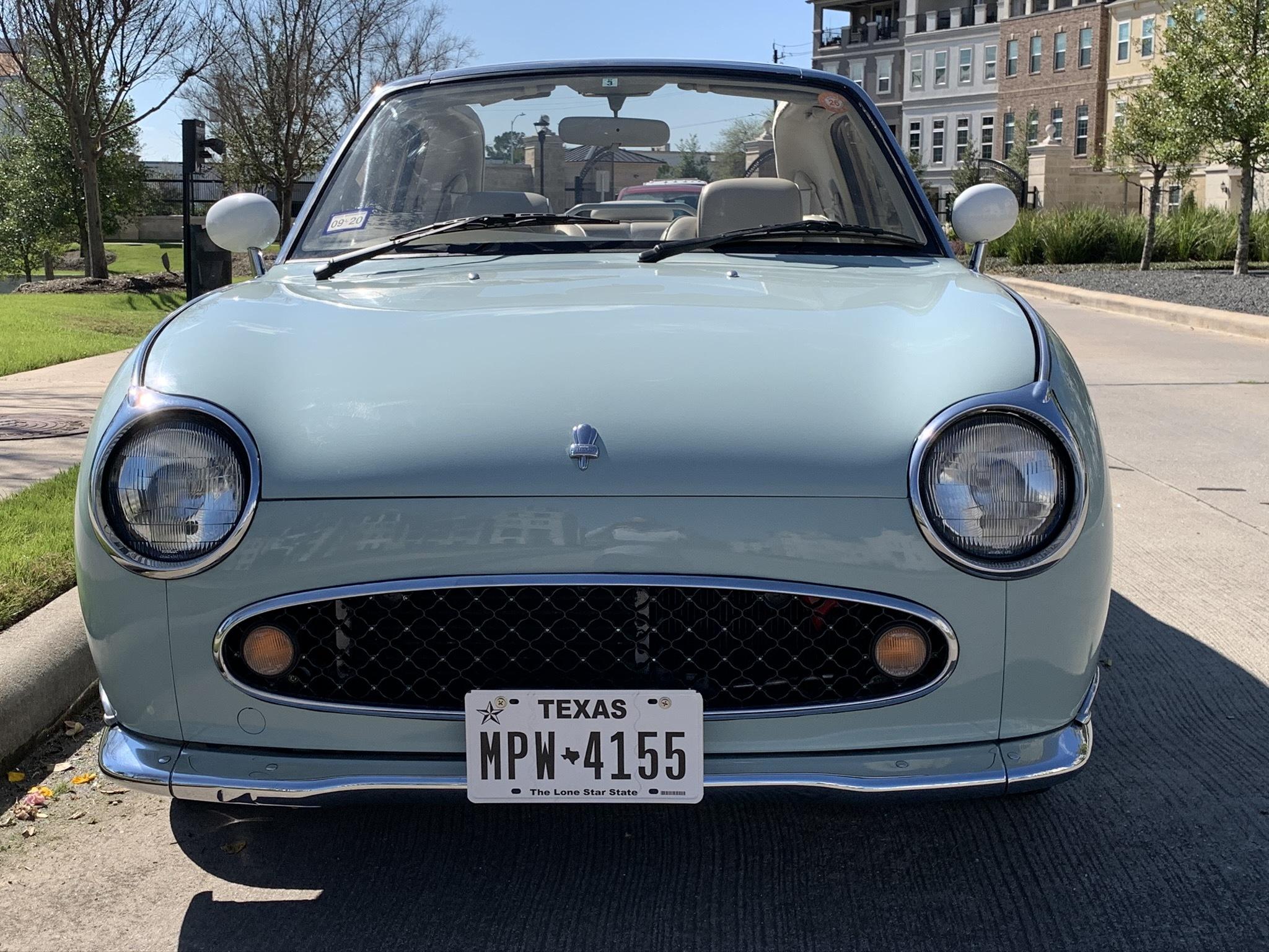 The top and window panels of the retractable vinyl roof were replaced by a previous owner according to the seller. The rubber top surround has been reconditioned and the window seals replaced along with the trunk struts. Stock 12″ steel wheels wear refinished white disc covers and chrome hubcaps, while Figaro-branded mud flaps are equipped at each corner.