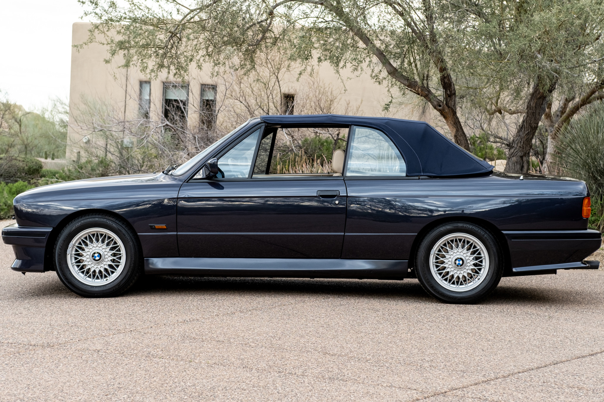 This example was finished from the factory in Macaoblau Metallic (250), which was only offered on M3 convertibles and special editions of the model. Various rock chips and other imperfections are noted in the finish, and there is a dent in the driver’s door under the base of the A-pillar. The dark blue, power-operated soft top was replaced in September 2008, and the car is also equipped with French-market yellow headlights featuring aim-control and a washing system.