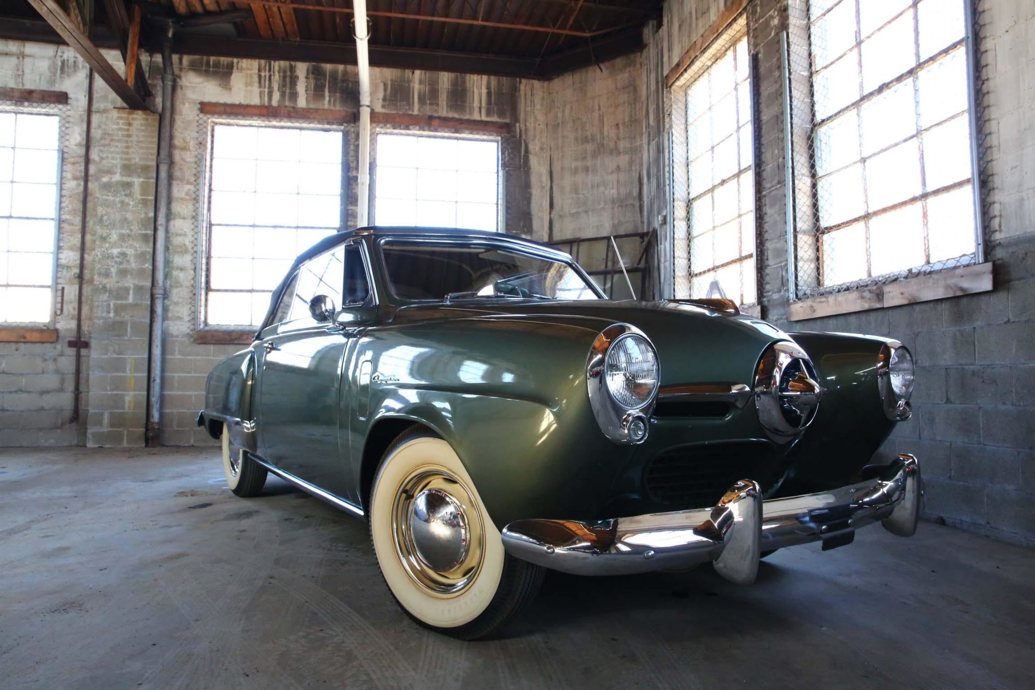 The seller reportedly installed a replacement factory-style cloth top with chrome rear window trim and also rebuilt the motors for the power top. Cream-colored steel wheels are fitted with chrome trim rings and Studebaker Champion–branded hubcaps, and Firestone Deluxe Champion whitewall tires are mounted.