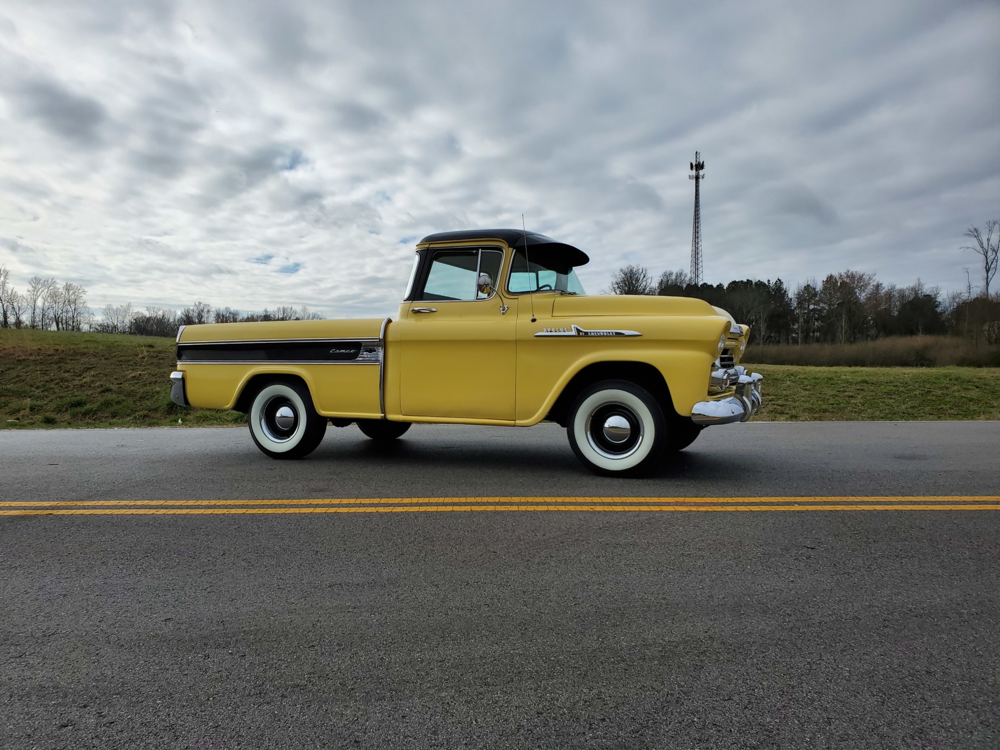 According to the seller, a repaint in yellow accented with a black cab roof and bed side trim was commissioned by a previous owner in the 1980s. Painted 15″ steel wheels wear polished beauty rings, chrome hub caps, and Coker Classic whitewall tires.
