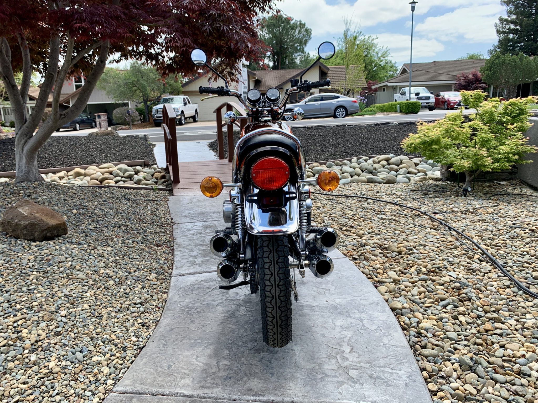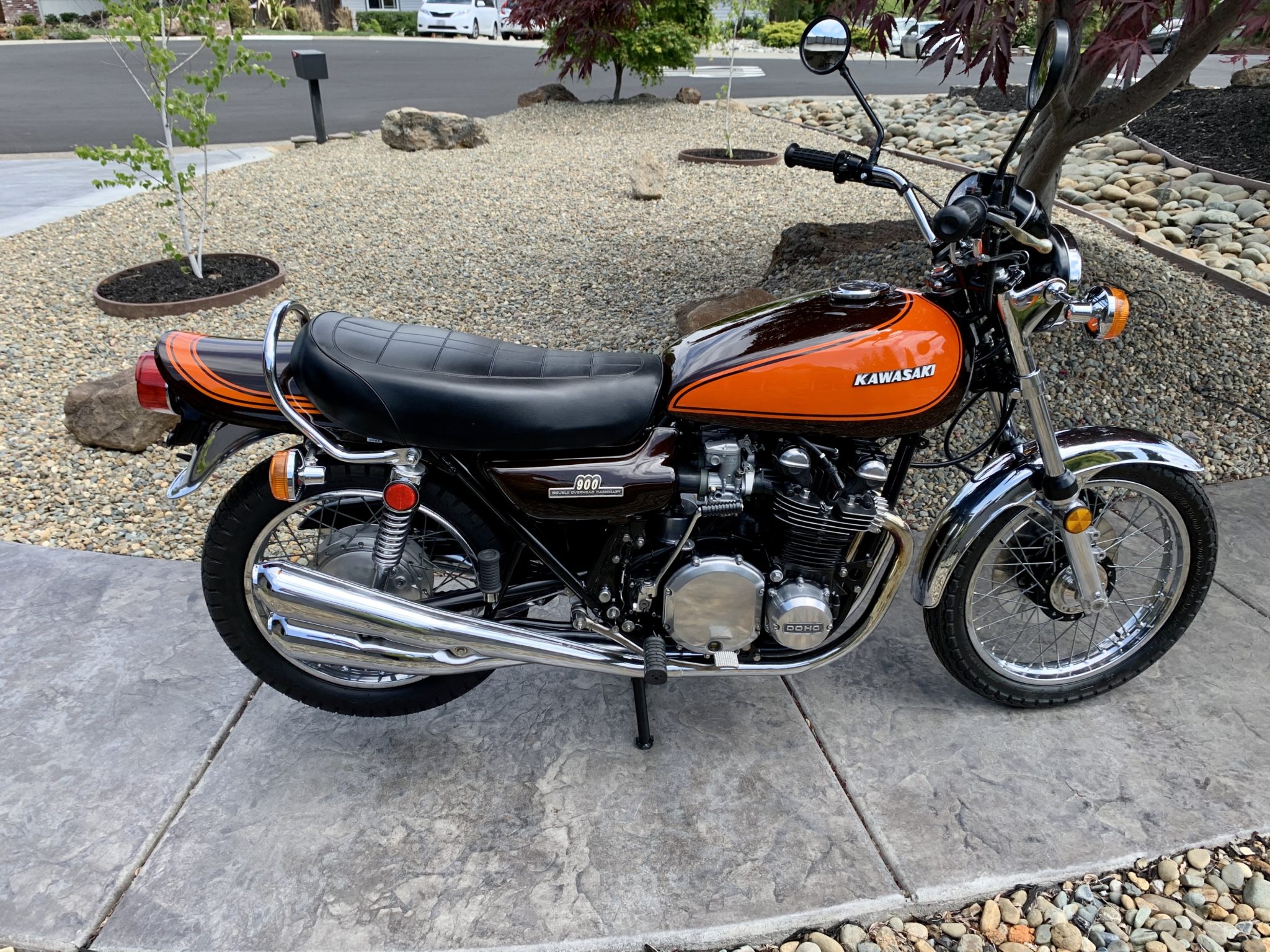 Chrome wire-spoke wheels measure 19″ front and 18″ rear and wear new replica Dunlop Z1 Gold Seal tires. Suspension consists of a conventional front end with polished lowers and an unstamped rear swingarm featuring a brass grease fitting and mounted with dual chrome shocks. The front disc brake system was refurbished by Z1 specialist Achim Huber in Berlin, Germany in August 2019, while the rear drum features an unstamped stay arm.