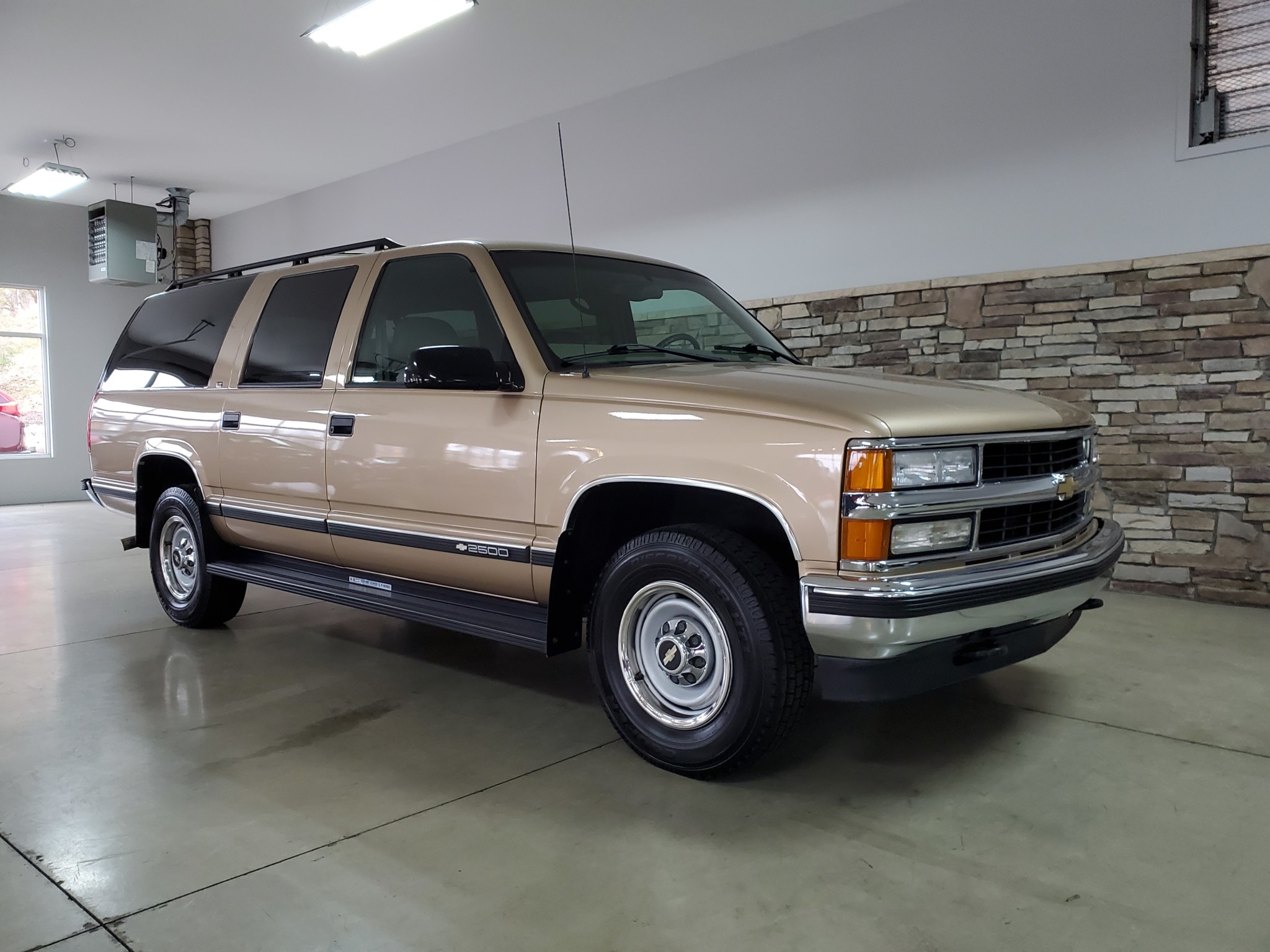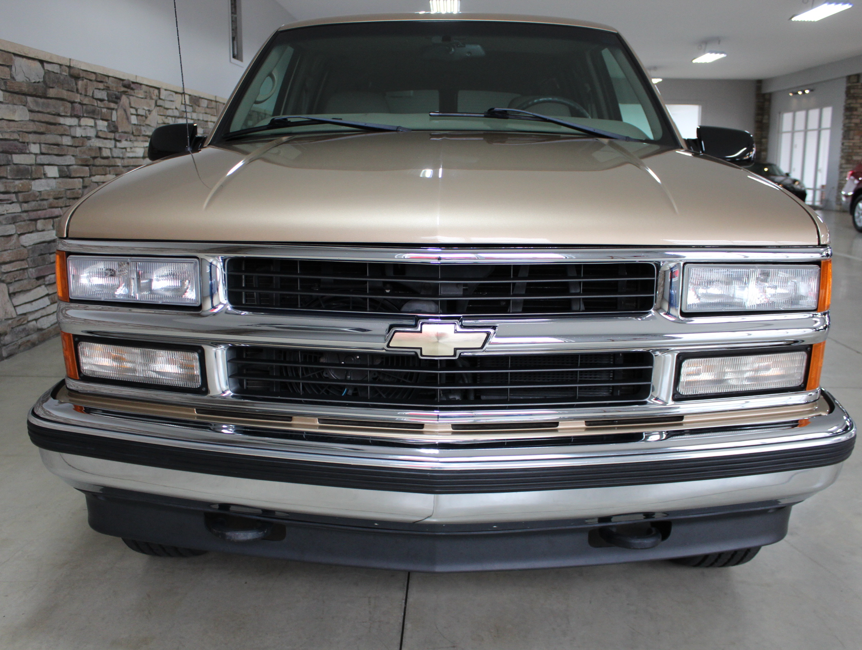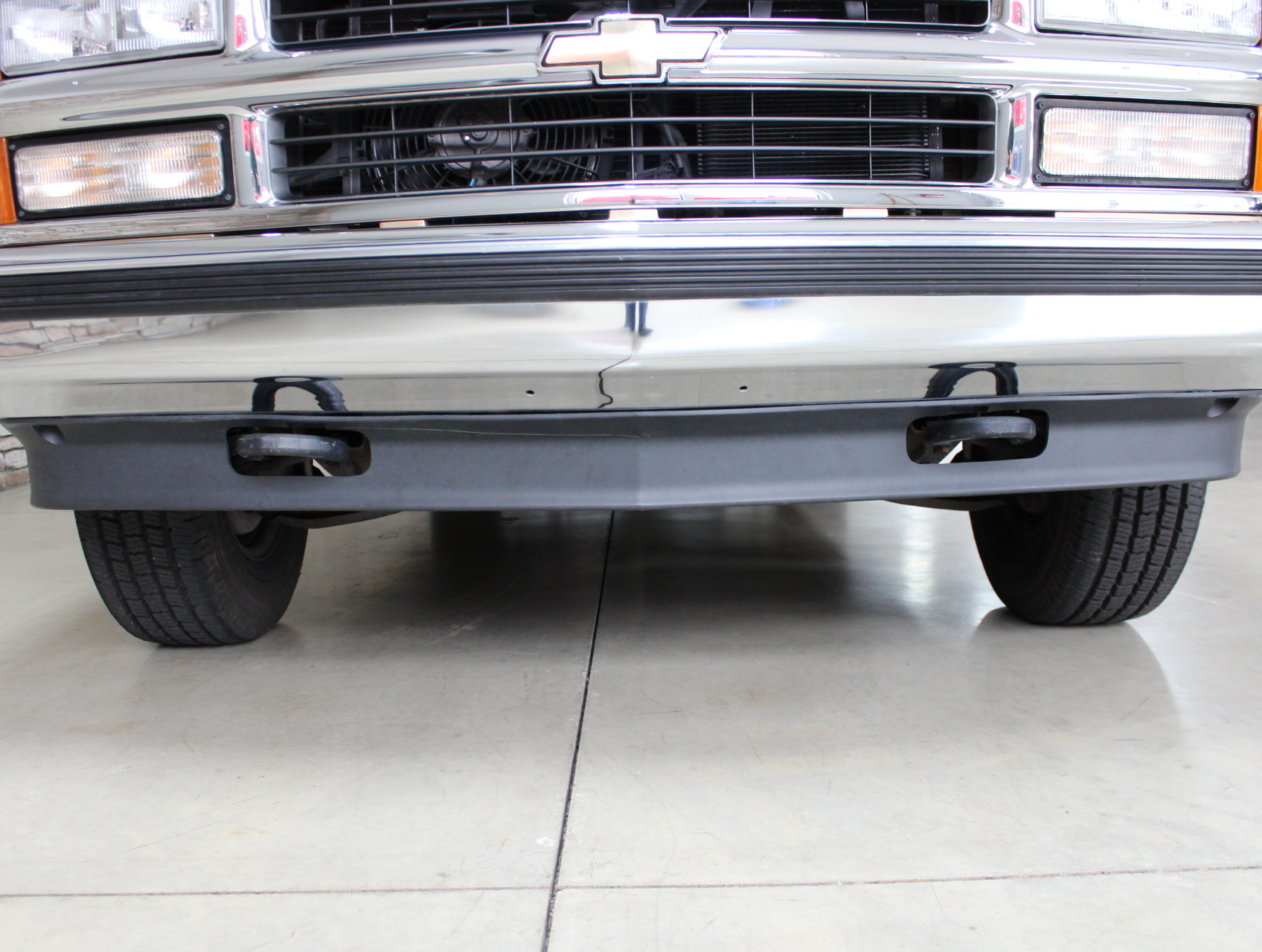 Equipment includes roof rails with crossbars, a receiver hitch, aftermarket running boards, and rear mud flaps. Eight-lug 16″ steel wheels with chrome beauty rings and hubcaps wear Cooper Discoverer HT3 tires. The selling dealer has replaced the front disc brake pads, and the truck is equipped with rear drums.