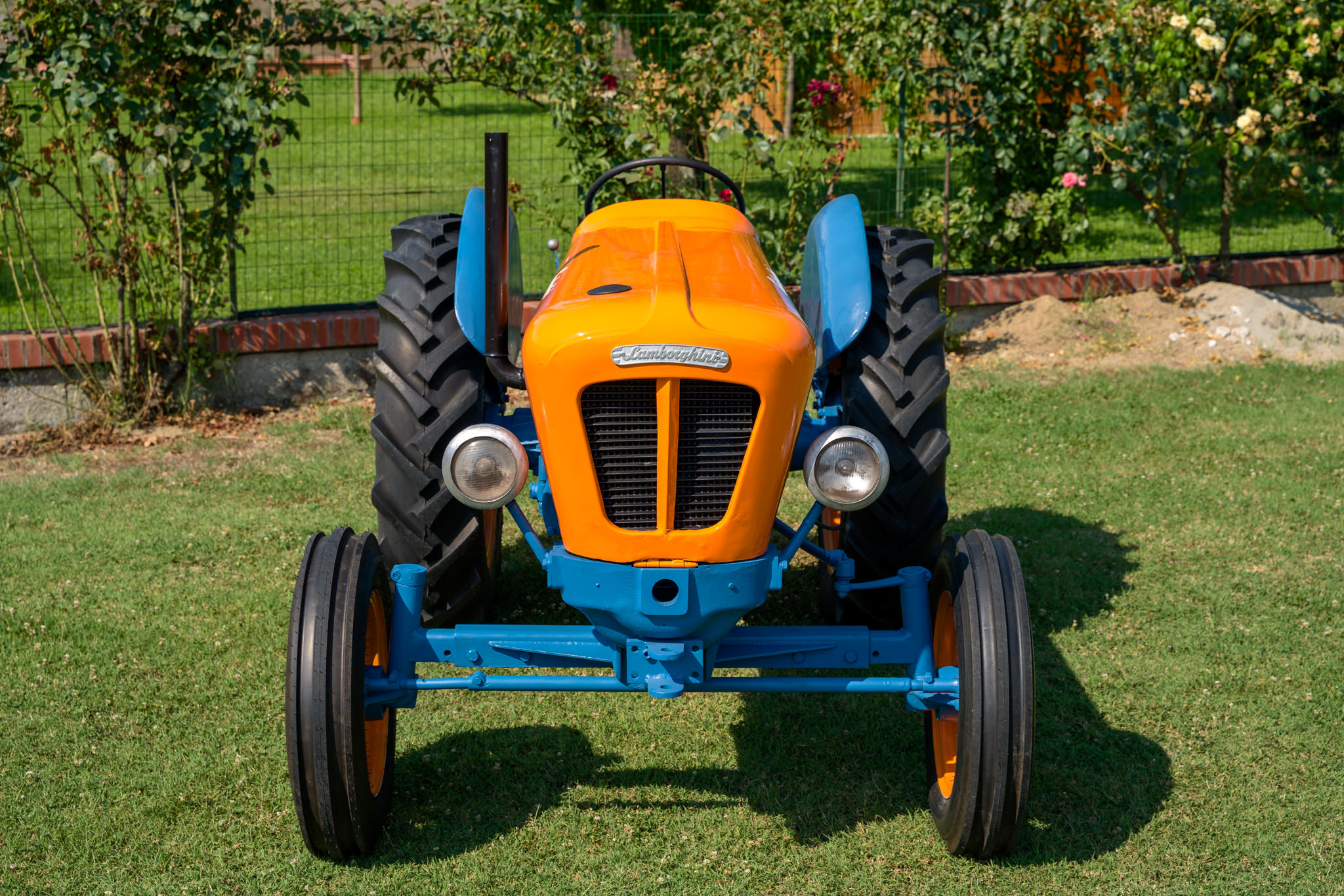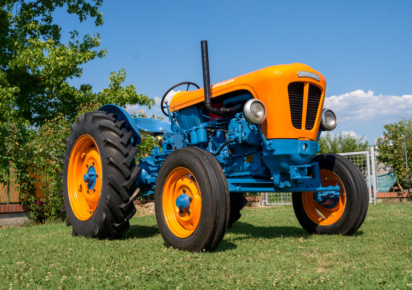 The tractor is equipped with dual rear PTO outputs, a rigid rear draw bar, and headlights. The 16″ and 28″ wheels are finished to match the hood, and are mounted with mixed tires up front and Rumaouma rubber out back.
