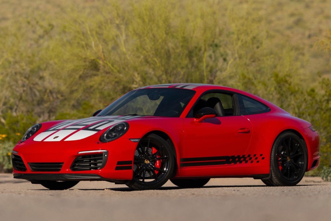Gloss black 20″ Carrera S wheels are fitted with colored Porsche crest center caps and wrapped in 245/35 and 305/30 Pirelli P Zero tires. Porsche Dynamic Chassis Control and Porsche Active Suspension Management were equipped from the factory along with rear axle steering.