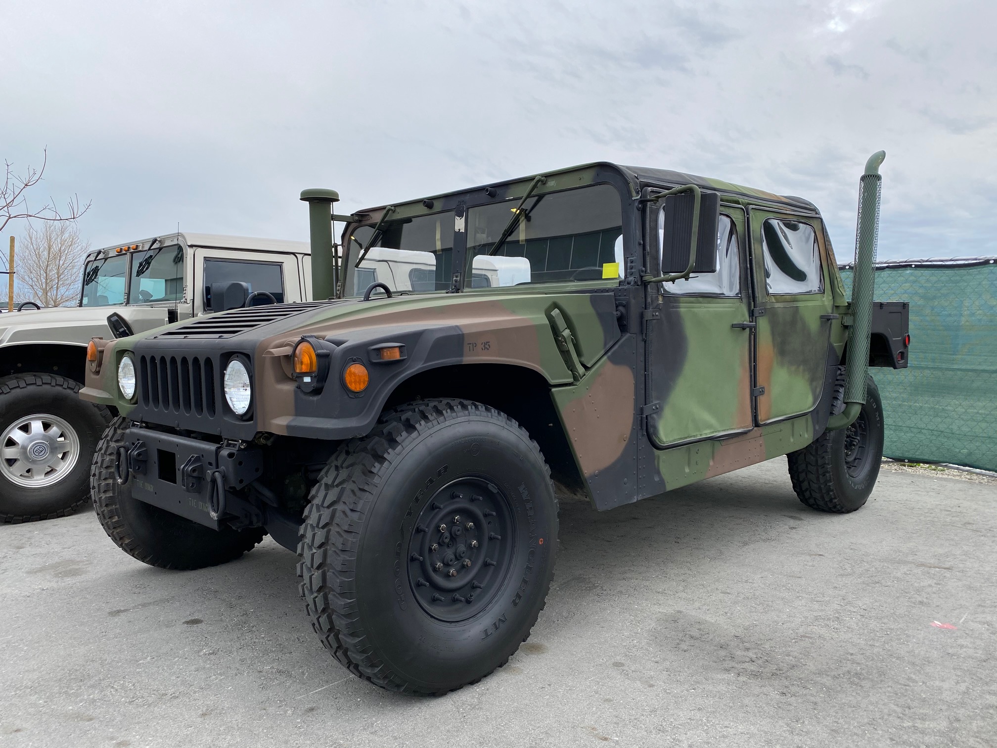 Additional equipment includes a raised air intake and exhaust outlet, recovery points, a pintle hitch, and an antenna. Black steel wheels wear 37″ Goodyear Wrangler MT tires.