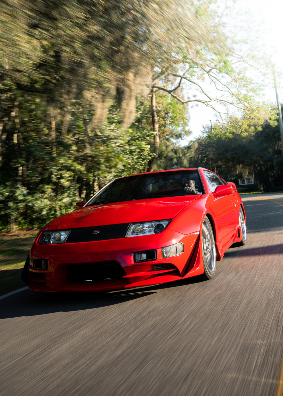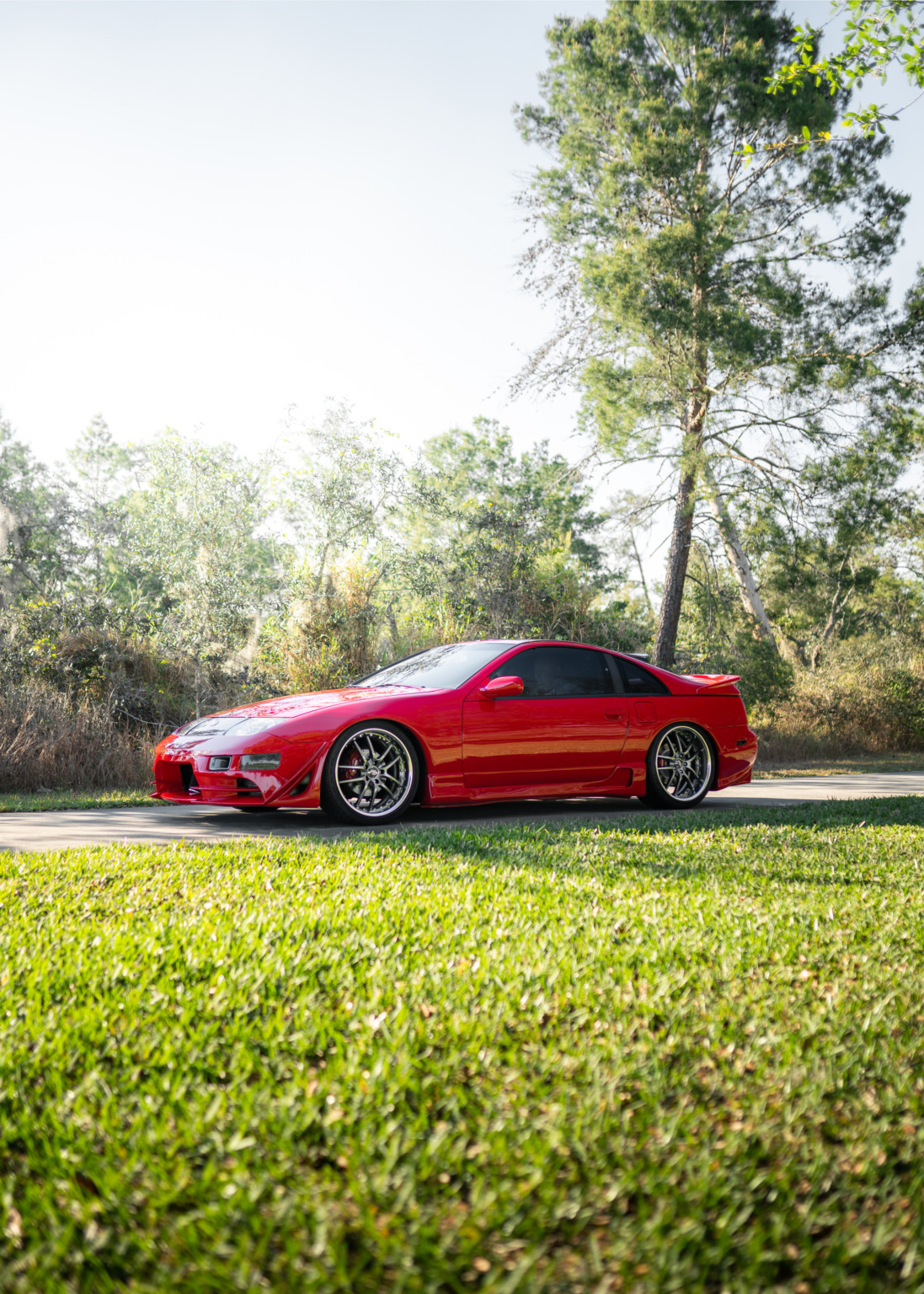 The car rides lower than stock on AMS coilovers and PIAA Super Rozza wheels wearing Nexen tires. All Z32s were equipped with four-piston front and two-piston rear brakes, and this example features a Z1 Motorsports brake booster brace and Goodridge stainless steel lines.