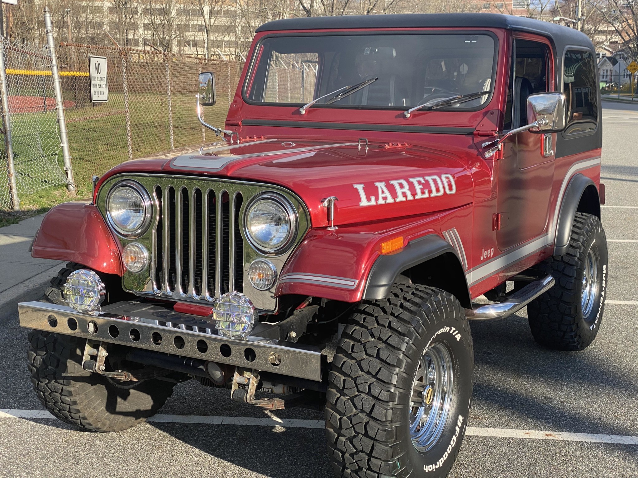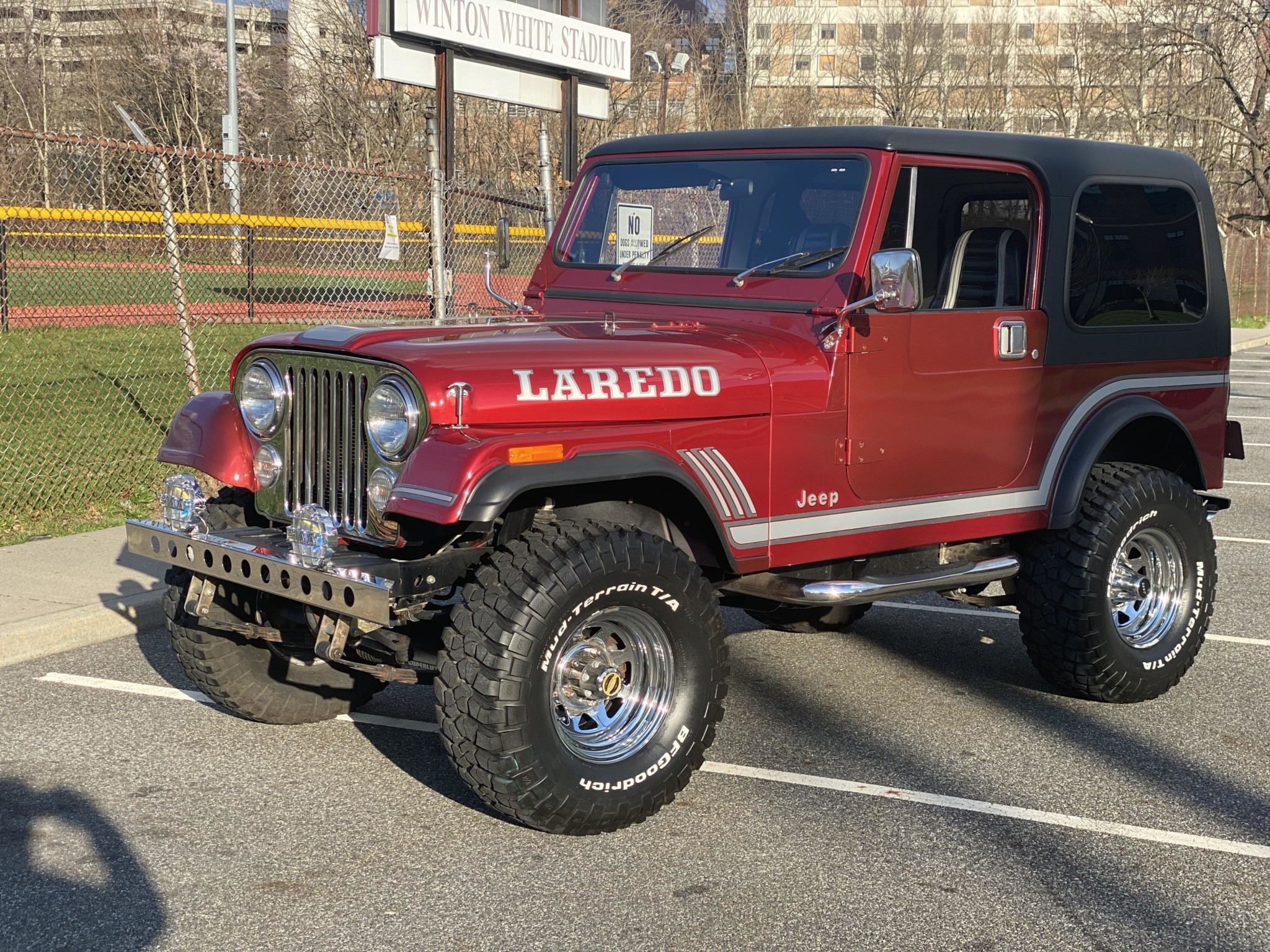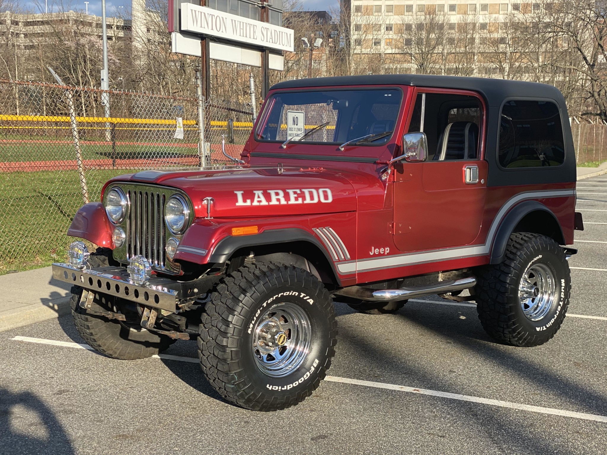 15″ polished wheels are mounted with 33×12.5″ BFGoodrich Mud-Terrain T/A KM2 tires, and a matching spare is mounted on the swing-out carrier at the rear. The seller notes that a lift kit has been added to the suspension.