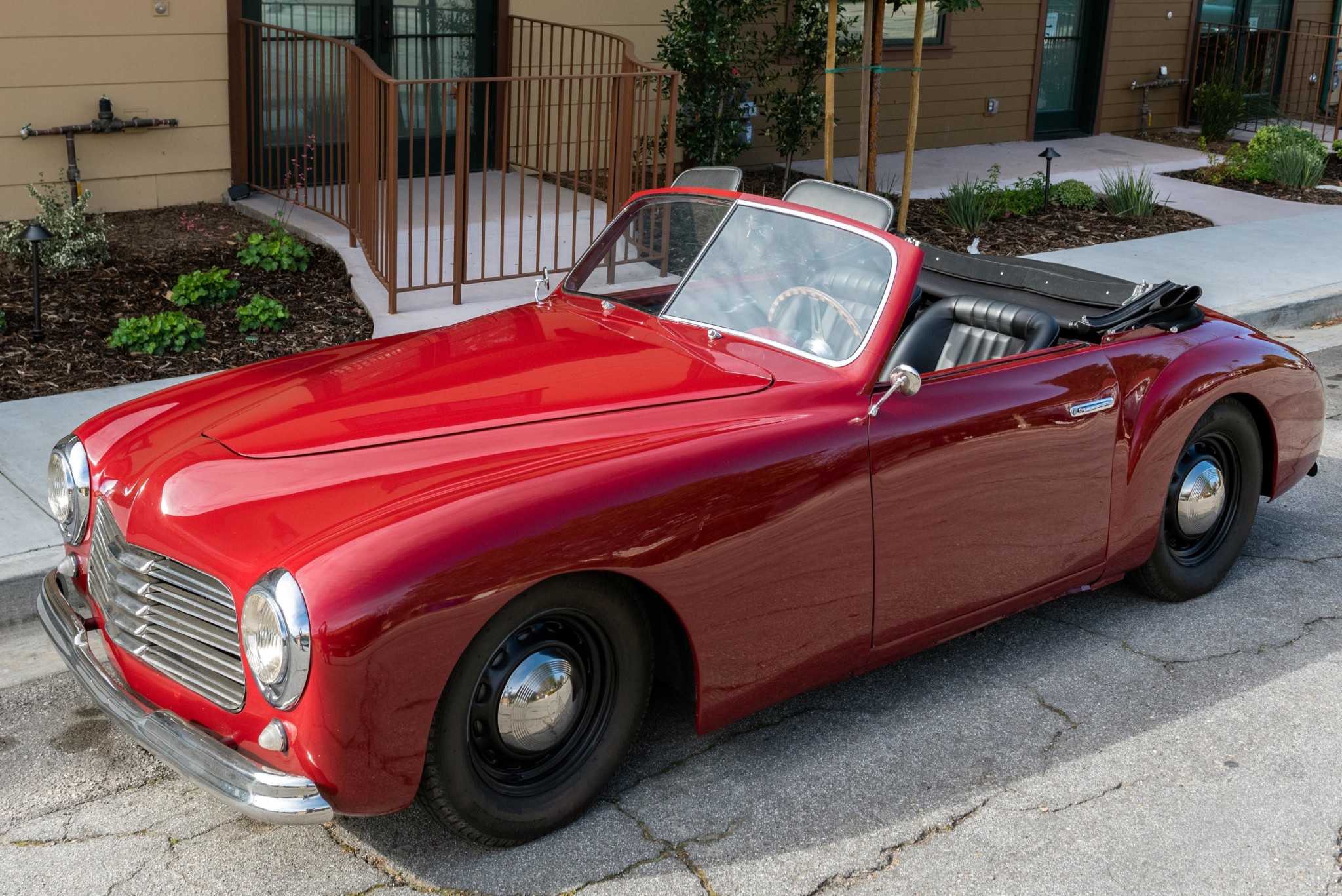 The body wears an older dark red finish that was touched up around the headlights under current ownership, while the convertible top was reupholstered in black canvas by Raul’s Auto Trim. Stamped steel wheels wear Ford V8 hubcaps and come wrapped in Excelsior Competition rubber from Coker Tire. The four-wheel drum brake system has been modified to use a dual-circuit master cylinder.