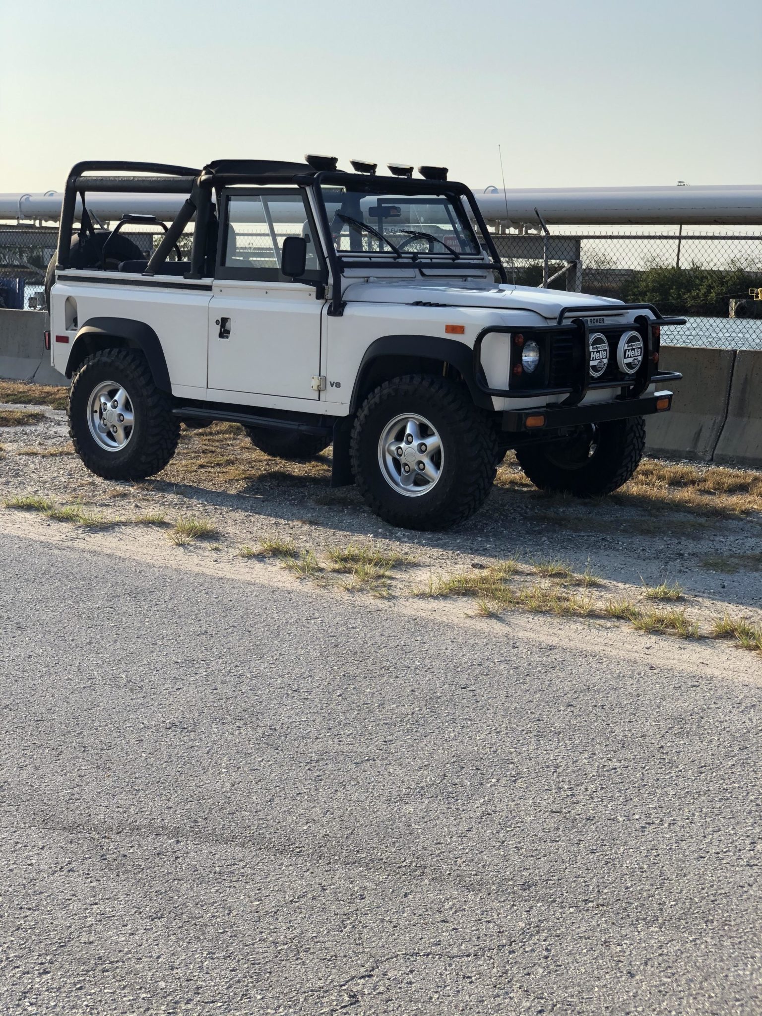 Factory 16″ five-spoke wheels wear 285/75 Toyo M/T Open Country tires. A full-size spare tire with a swing-away frame is mounted on the tailgate, and NAS Defenders were equipped with four-wheel disc brakes and anti-sway bars. The seller states that Terrafirma shock absorber mounts are installed.