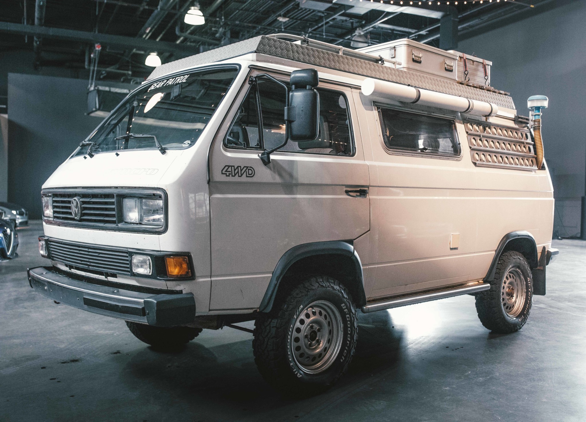 The four-wheel drive Syncro model was developed by Steyr-Puch in conjunction with Volkswagen, and the 16″ variant featured a reinforced chassis, black wheel arch flares, locking differentials, and larger brakes. This example rides on refinished 16″ Mefro steel wheels wearing BFGoodrich All Terrain T/A KO2 tires, and a matching spare is mounted on a swing-away carrier at the rear.