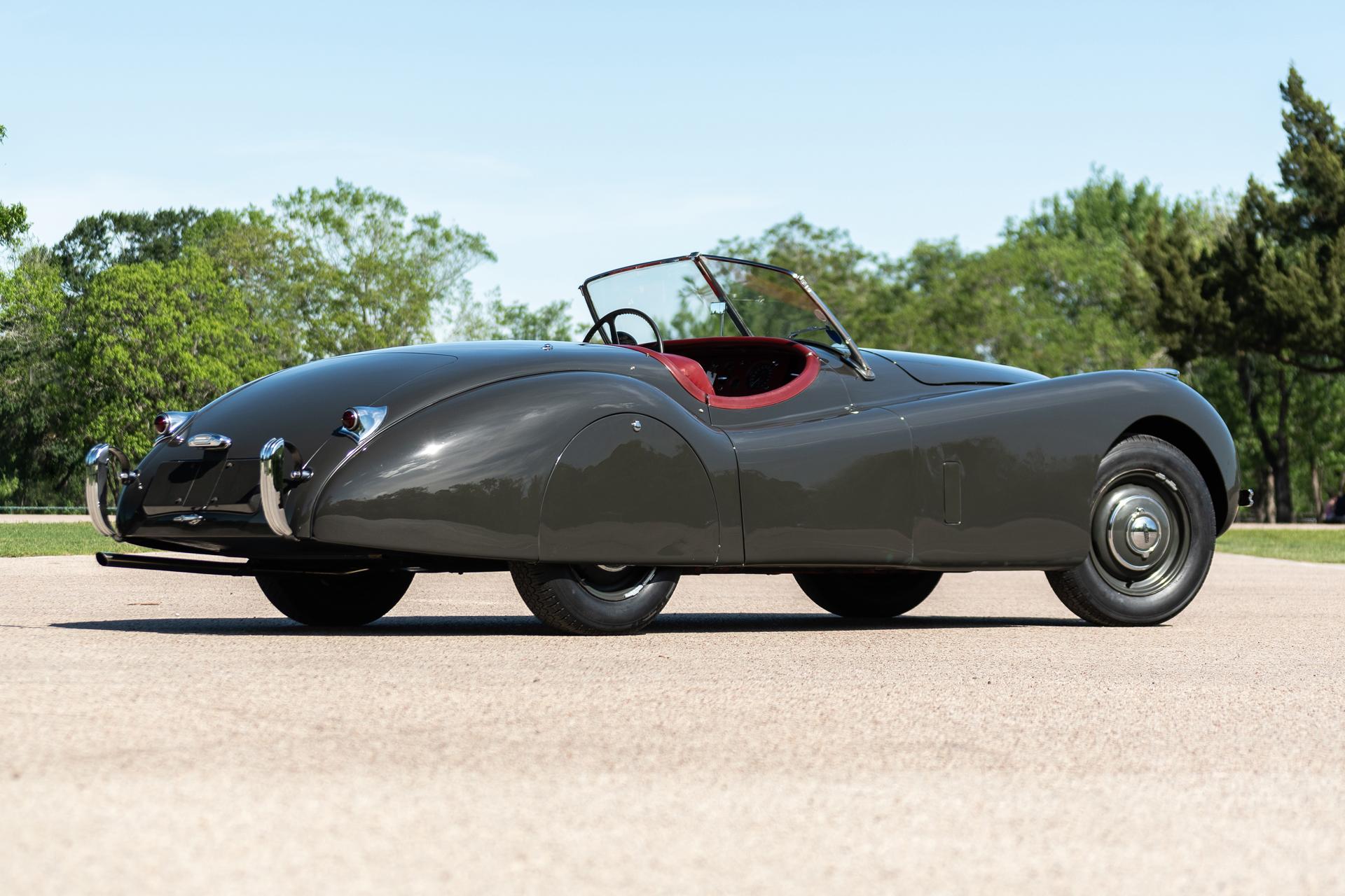 Body-colored steel wheels wear Jaguar hubcaps and Pirelli Cinturato tires with 2017 date codes. A matching spare is mounted under the trunk floor. The key for the rear wheel spats can be seen in operation in the gallery. A 2018 service included replacement of the wheel bearings as well as the brake master cylinder, shoes, and hoses.