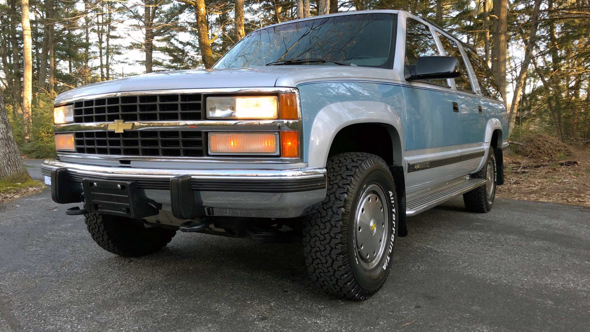 16″ steel wheels wear Chevrolet covers and 245/75 BFGoodrich All-Terrain KO tires. A spare tire is mounted in the rear cargo area and four Enkei five-spoke wheels accompany the sale.