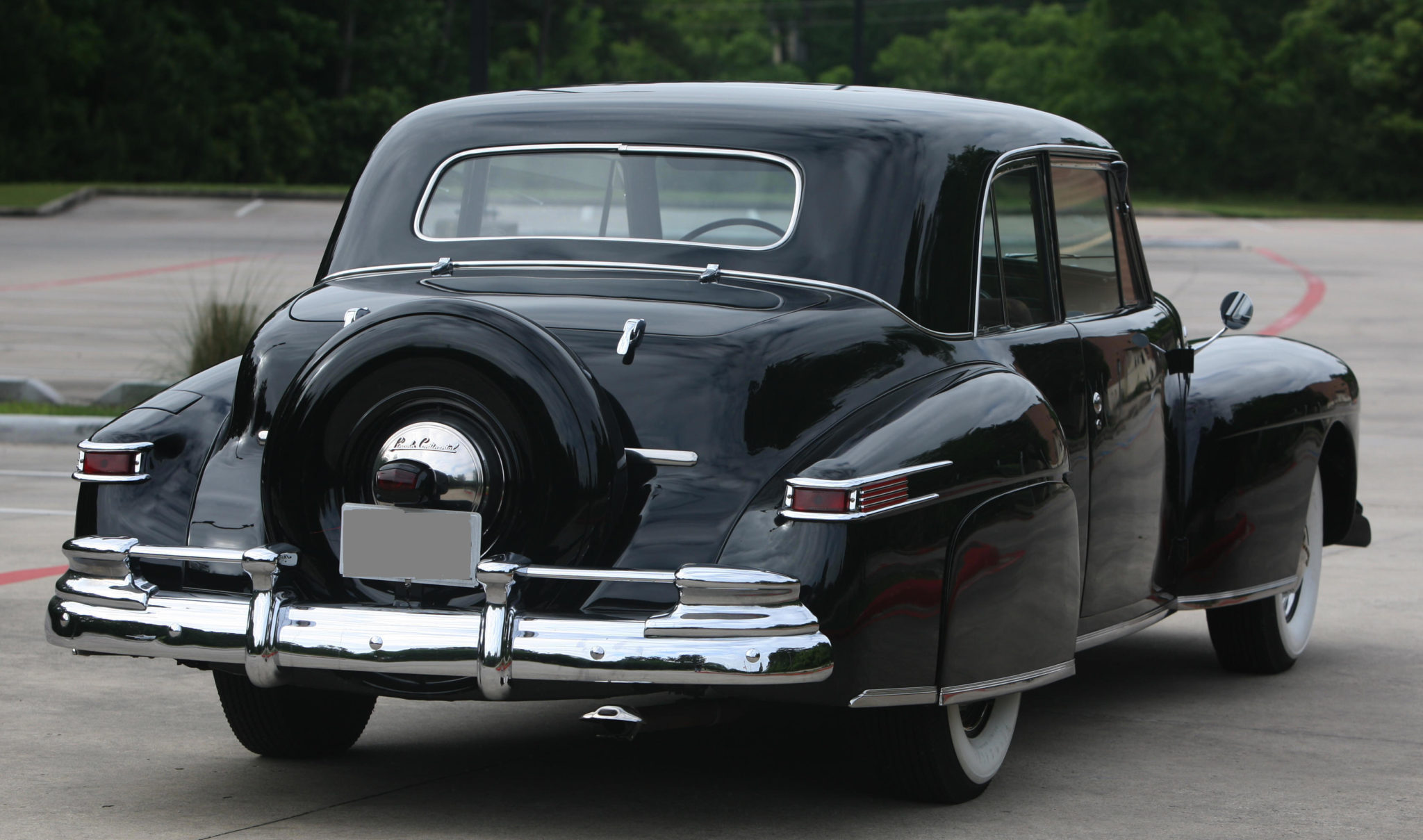 Steel 15″ wheels are fitted with chrome beauty rings, hub caps featuring gold Lincoln scripts, and Firestone wide-whitewall tires. An external spare wheel carrier is mounted behind the trunk. Equipment includes a vacuum-operated antenna that the seller notes does not function, and must be raised and lowered manually.