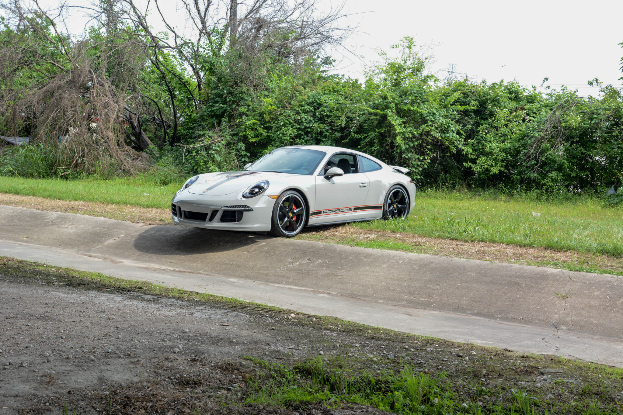 The 20″ Sport Classic wheels are finished in black with polished lips and wear full-color Porsche crests. They are mounted with Pirelli PZero tires measuring 245/35 up front and 305/30 at the rear. Braking is handled by four-wheel vented and cross-drilled discs with red-finished calipers, and the car is equipped with PASM Sport suspension.