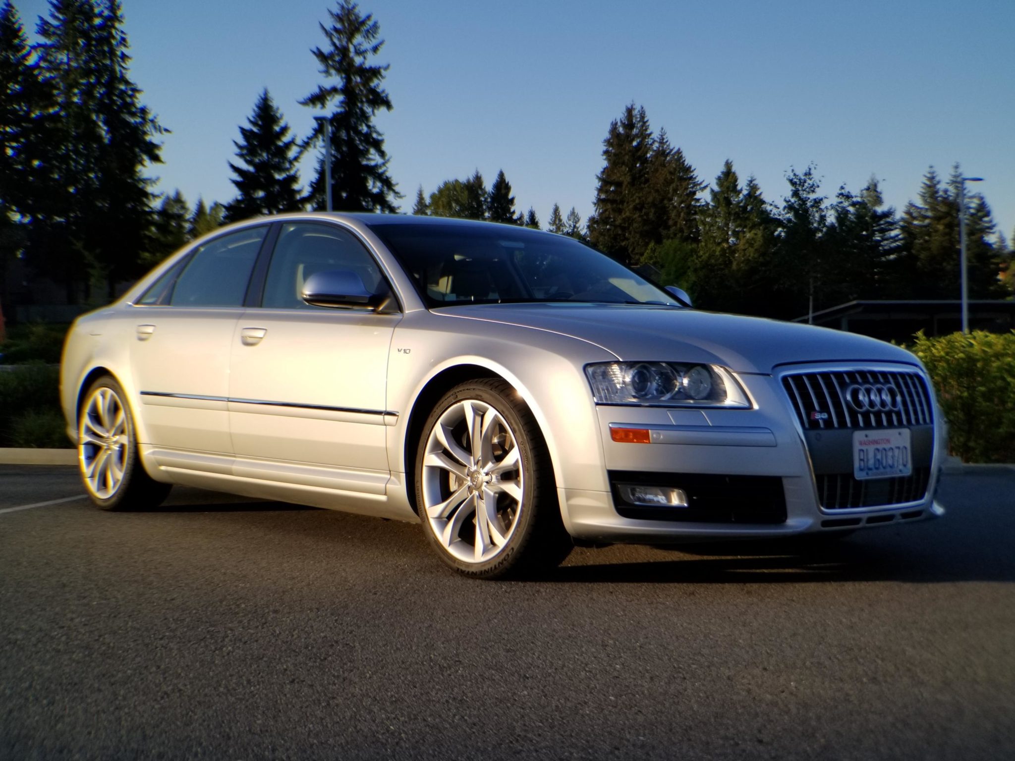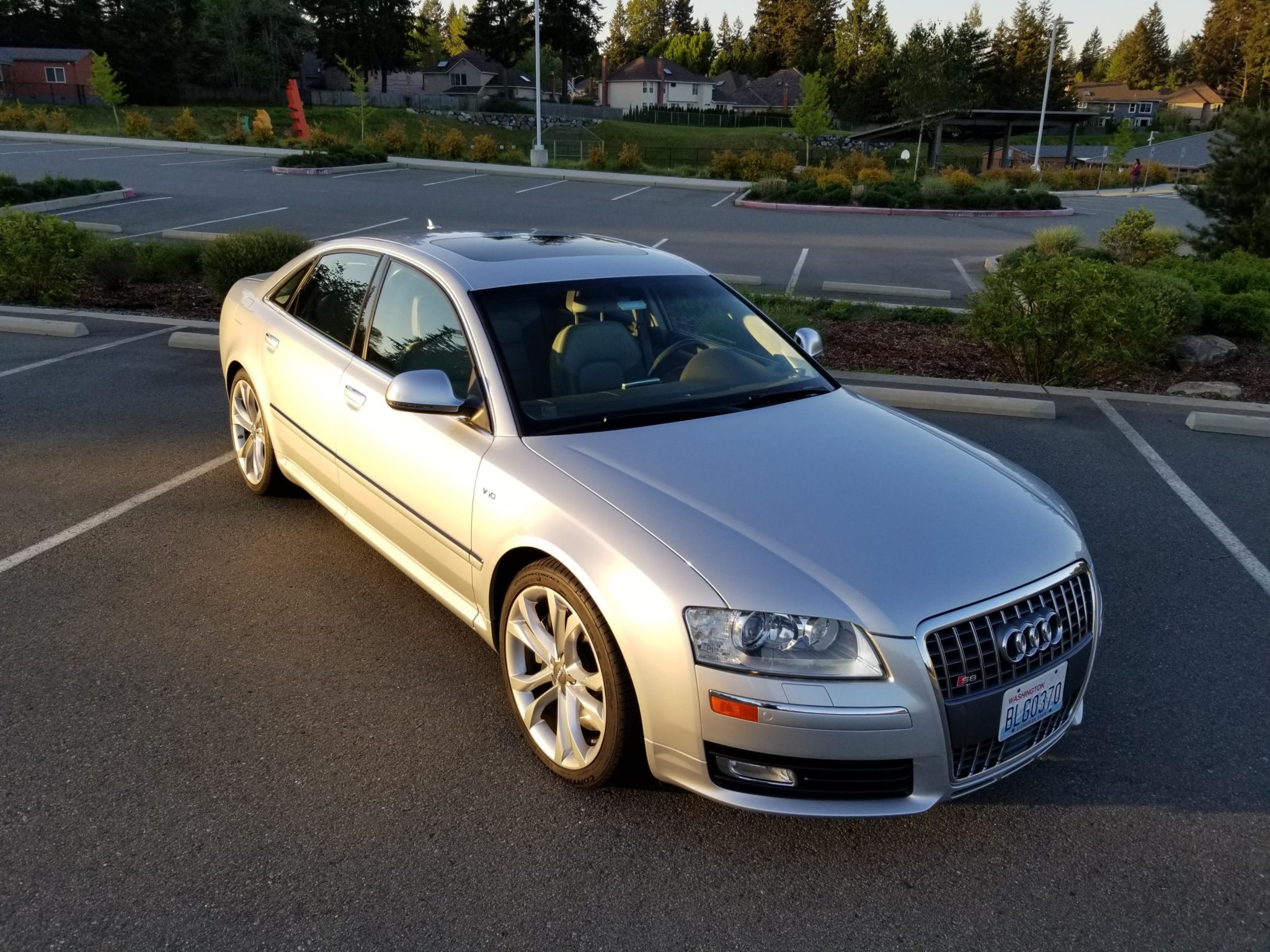 Factory 20″ alloy wheels exhibit curb rash and are wrapped in Continental ExtremeContact tires that show 2017 date codes. Equipment includes quad exhaust outlets, a power sunroof with an integrated solar panel, adaptive bi-xenon headlamps, an integrated lip spoiler, power mirrors with aluminum enclosures, V10 badging, and front and rear fog lights.
