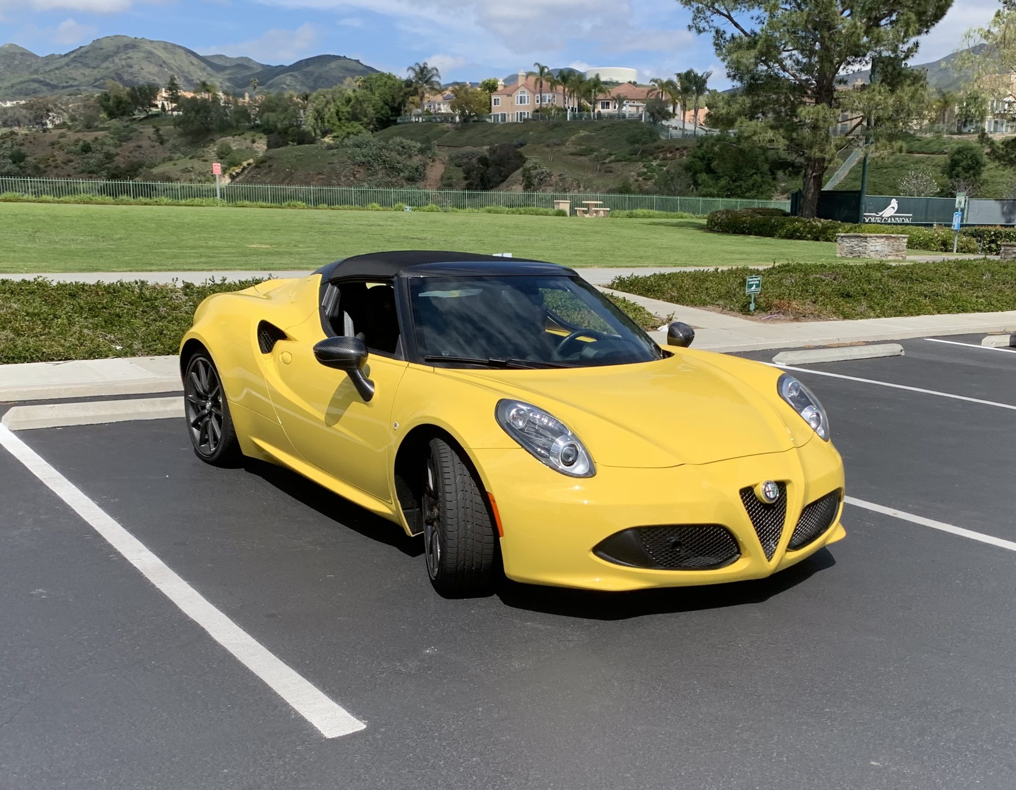 Optional 18″ and 19″ Dark Fan Spoke wheels are mounted with 205/40 front and 235/35 rear Pirelli tires. The optioned 4C Spider Track Package includes race-tuned suspension, and braking is handled via multi-piston calipers finished in Alfa Romeo Yellow.