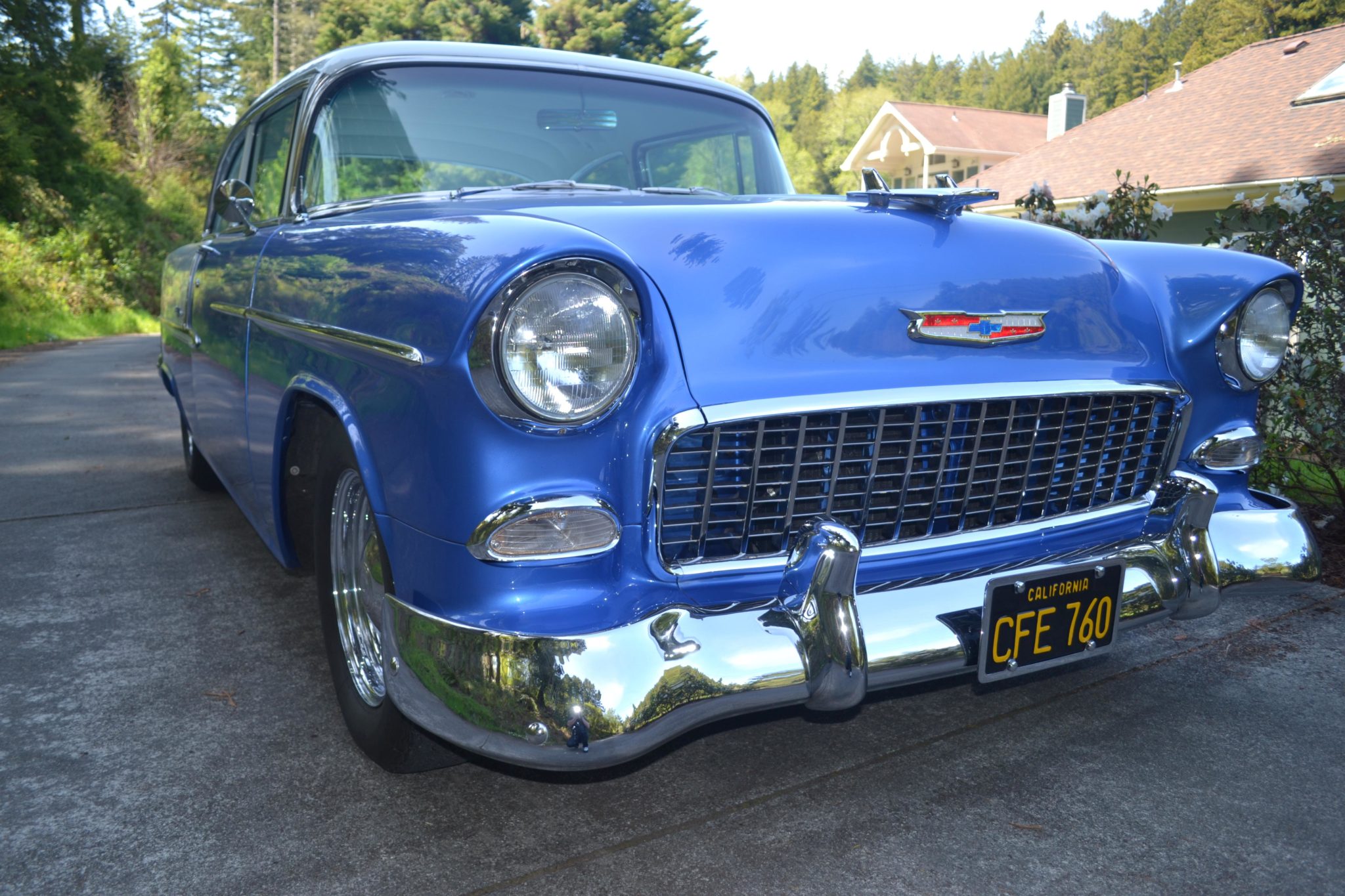 The car has been lowered with dropped spindles in the front and leaf springs in the rear. Steel 15″ wheels wear Bowtie hubcaps and 225/70 Michelin radial tires. Front and rear sway bars, a rear shock-mount crossmember, and KYB gas shocks were installed during the refurbishment along with power-assisted steering and front disc brakes.
