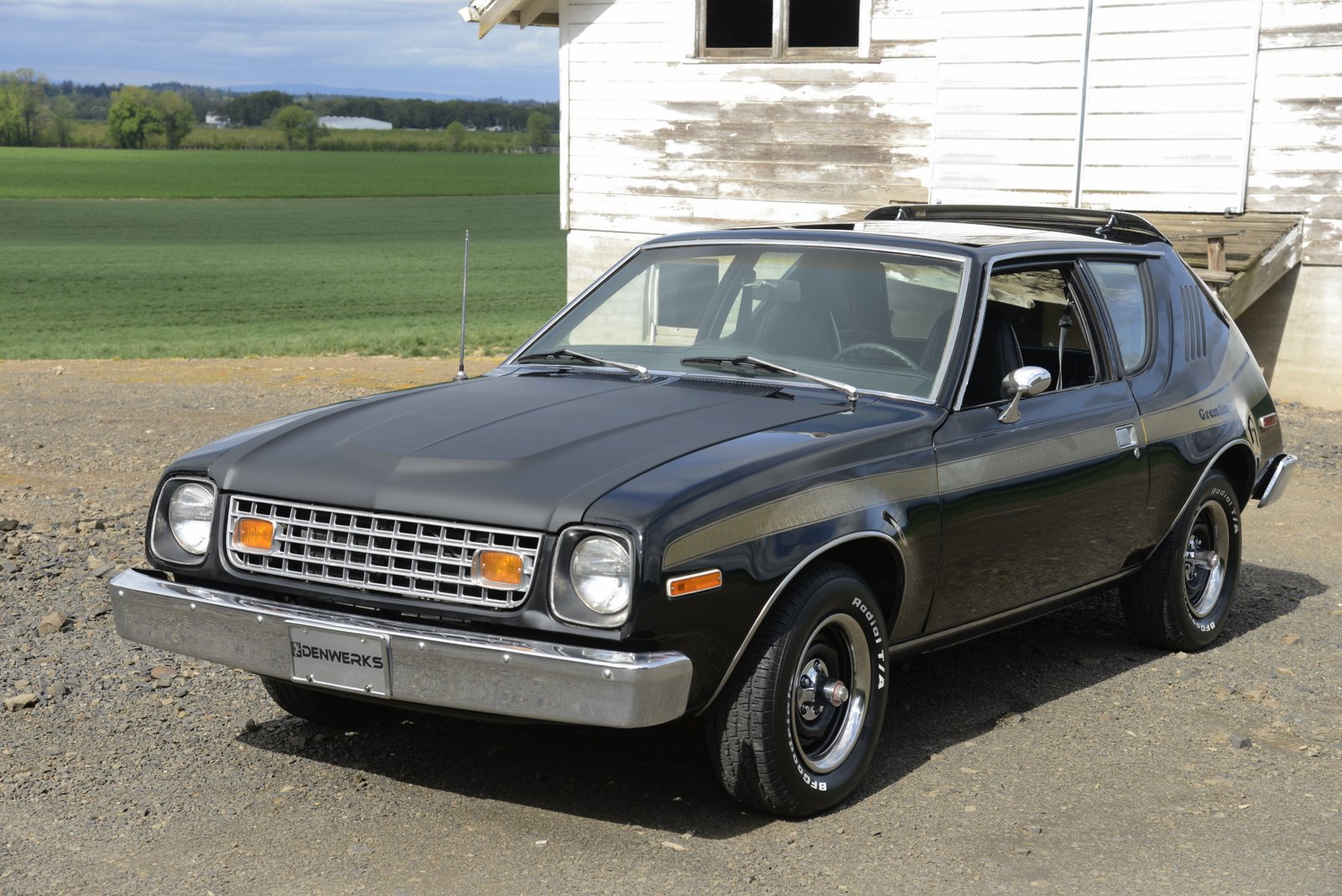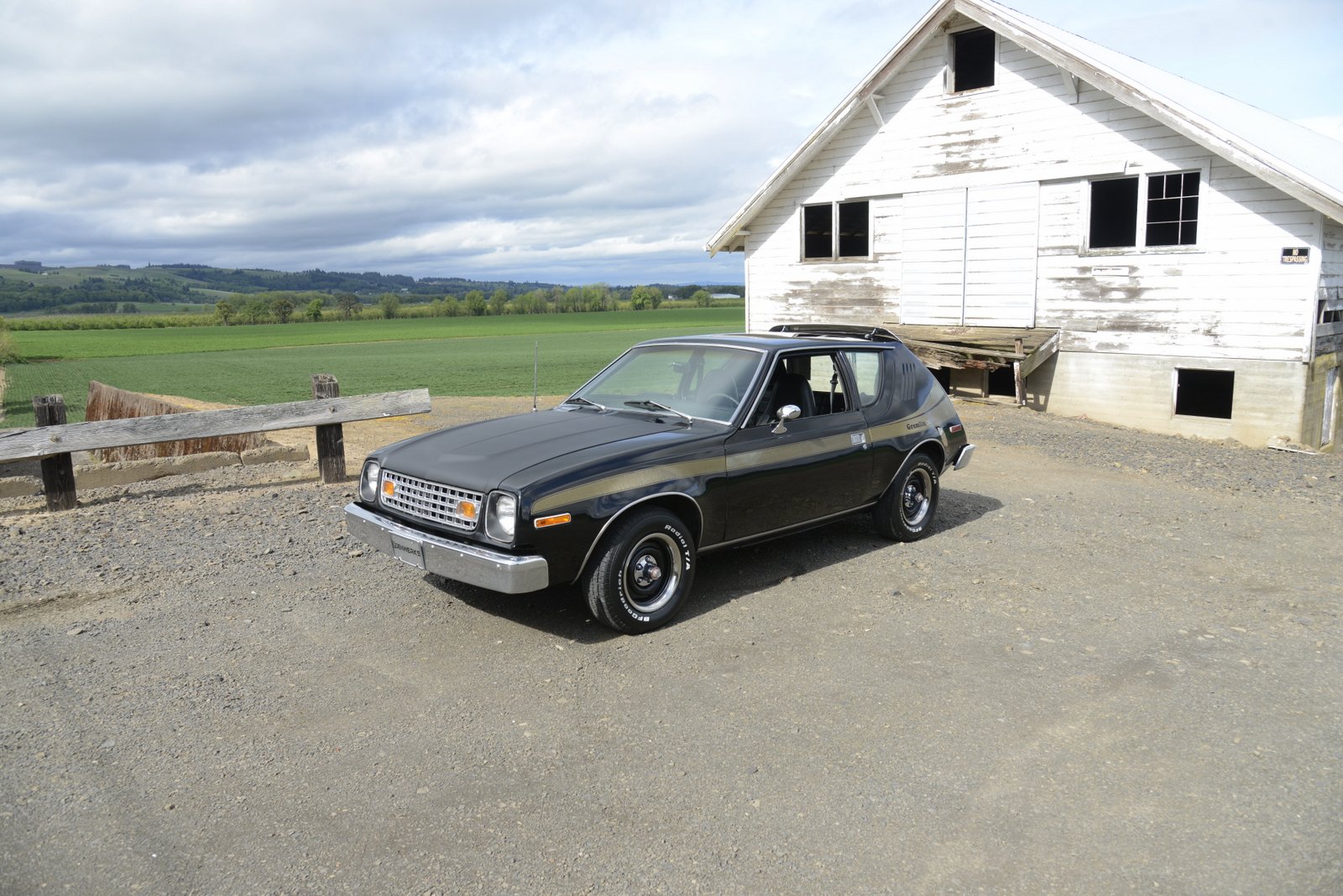 Factory 14″ steel wheels are finished in black and are fitted with trim rings and AMC-branded center caps. The mounted BFGoodrich Radial T/A tires measure 205/70 and show 2019 date codes. Braking is handled by discs up front and drums at the rear, and the seller reportedly replaced the pads, rotors, drums, shoes, hardware, and wheel bearings within the past six months.