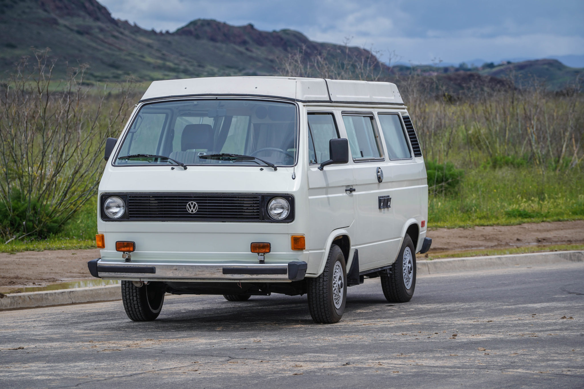 14″ steel wheels are fitted with mesh-style wheel covers and Volkswagen center caps, and the mounted American Classic tires measure 205/75. Braking is handled by front discs and rear drums, the latter of which are worn according to an included invoice.