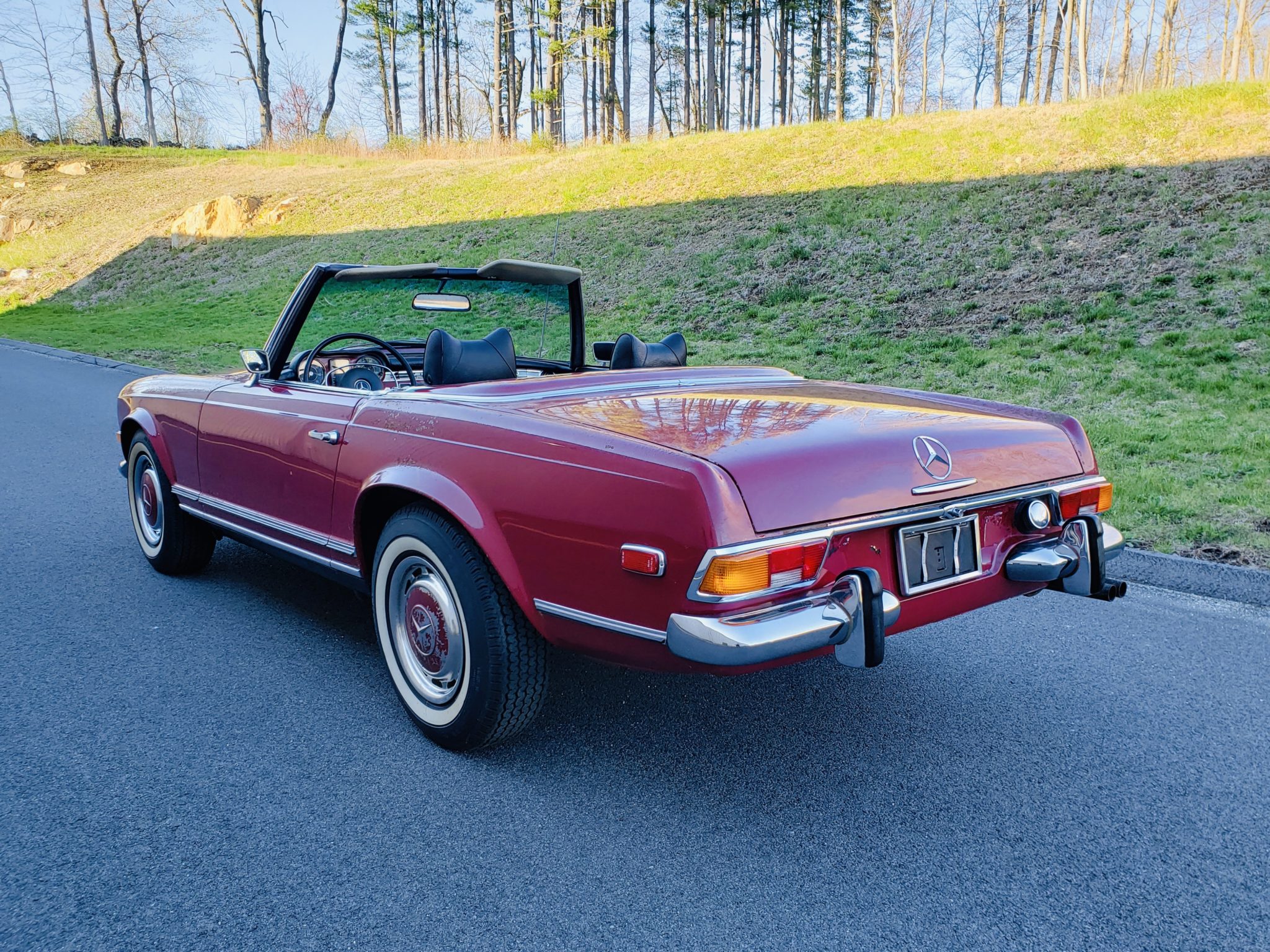 A color-matched hardtop and removal tools are included in the sale. Factory 14″ steel wheels wear polished and painted covers along with older Michelin X whitewall tires. Paint can be seen flaking from the left rear wheel cover. The selling dealer notes the braking system will need to be serviced before the car can be driven.