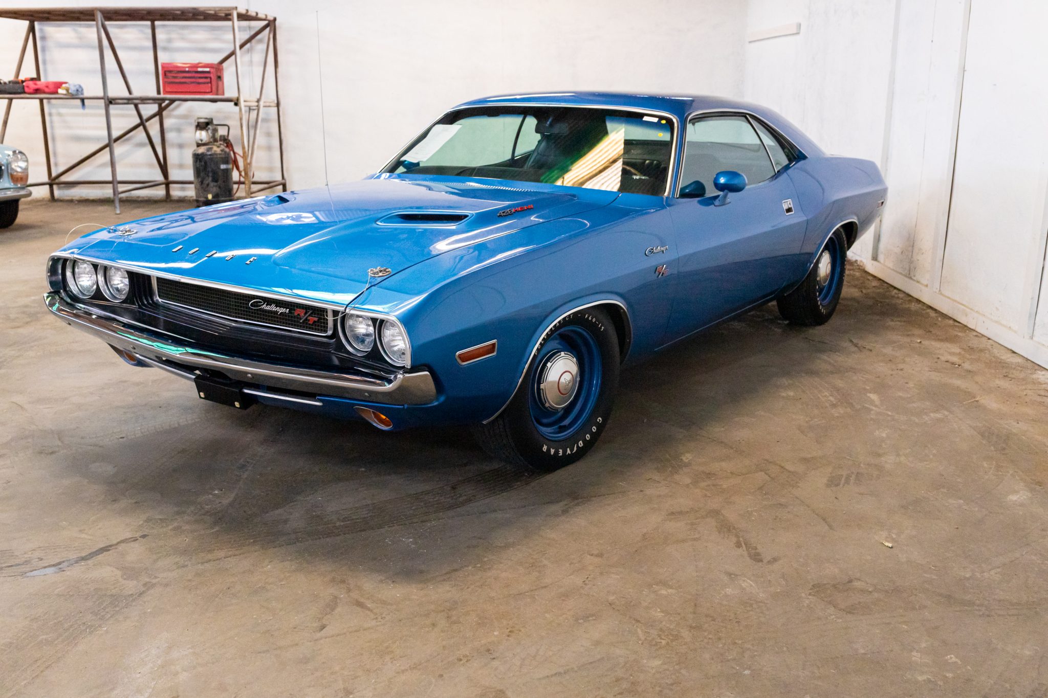 Painted 15″ steel wheels wear dog-dish hubcaps and are shod with Goodyear Polyglas GT F60 white-letter tires.