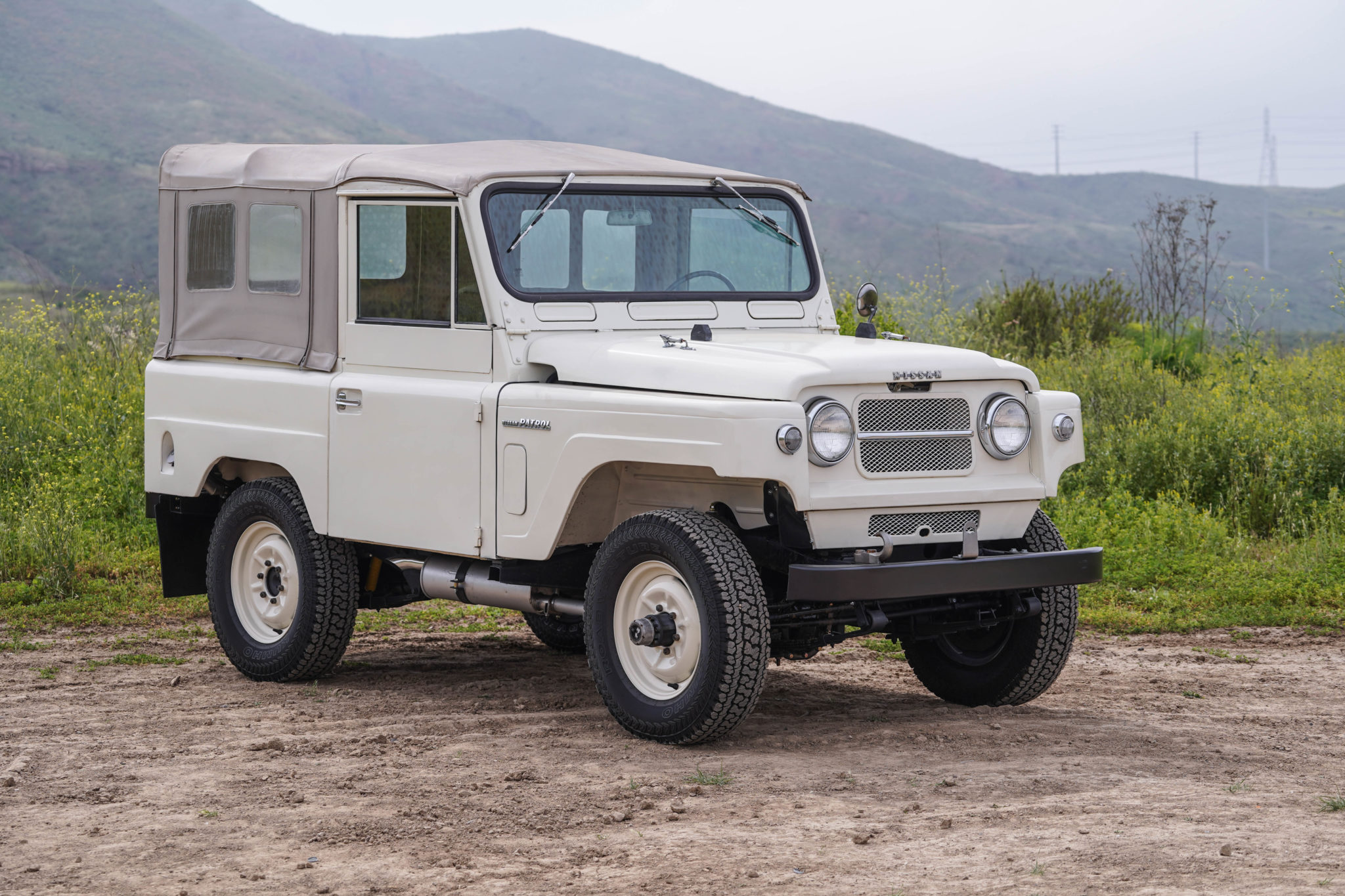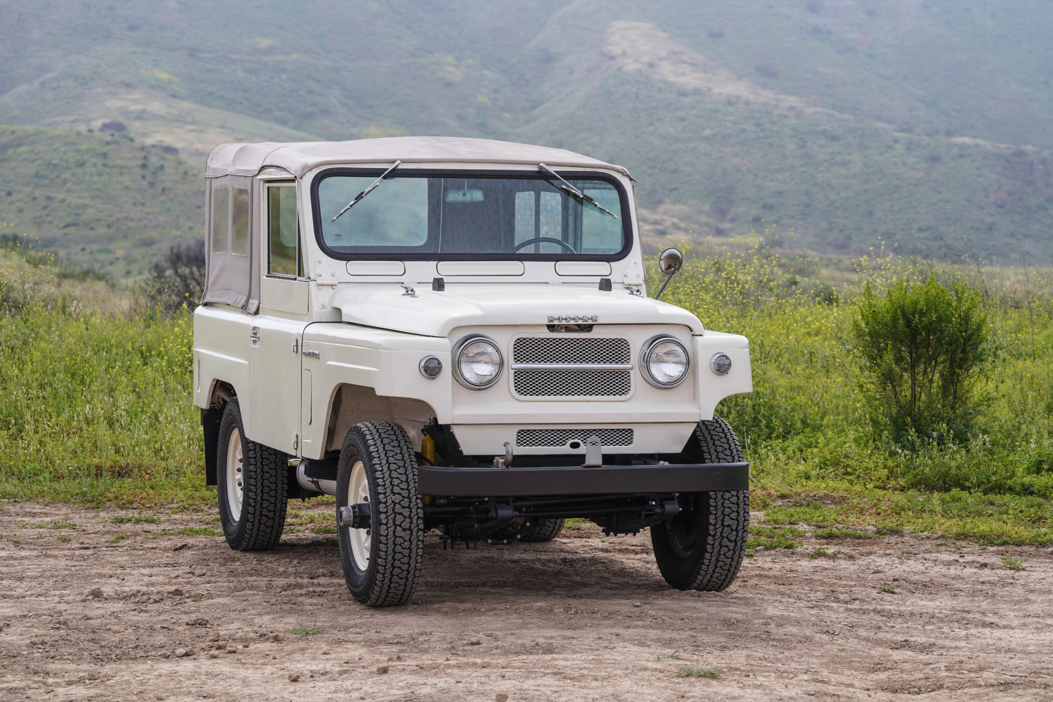 The upper doors are removable, and the replacement canvas top features roll-up plastic side and rear windows. The folding windscreen is equipped with built-in overhead wiper motors. 16″ steel wheels are finished in the body color, and the seller has replaced the spare wheel due to a bend. The mounted Kumho Roadventure AT51 tires measure 215/75 and show 2019 date codes.