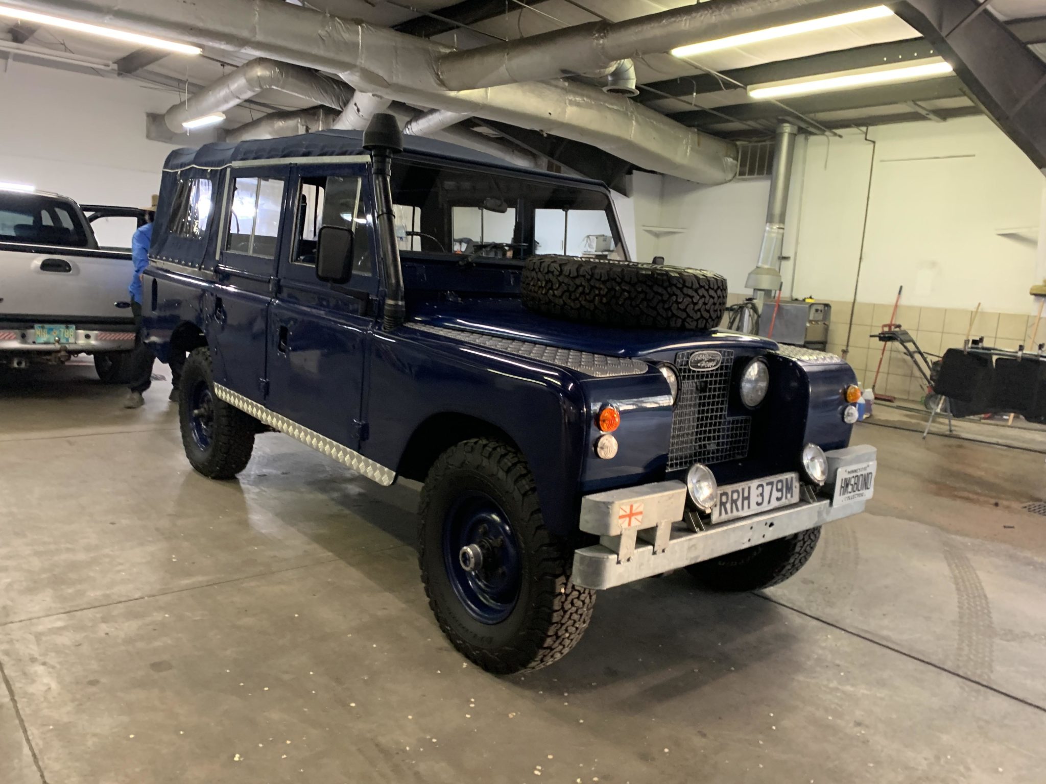 Blue 15″ steel wheels are mounted over Superwinch manually-locking hubs up front and wear BFGoodrich All-Terrain T/A KO2 tires at all four corners. A matching spare is affixed to the hood.
