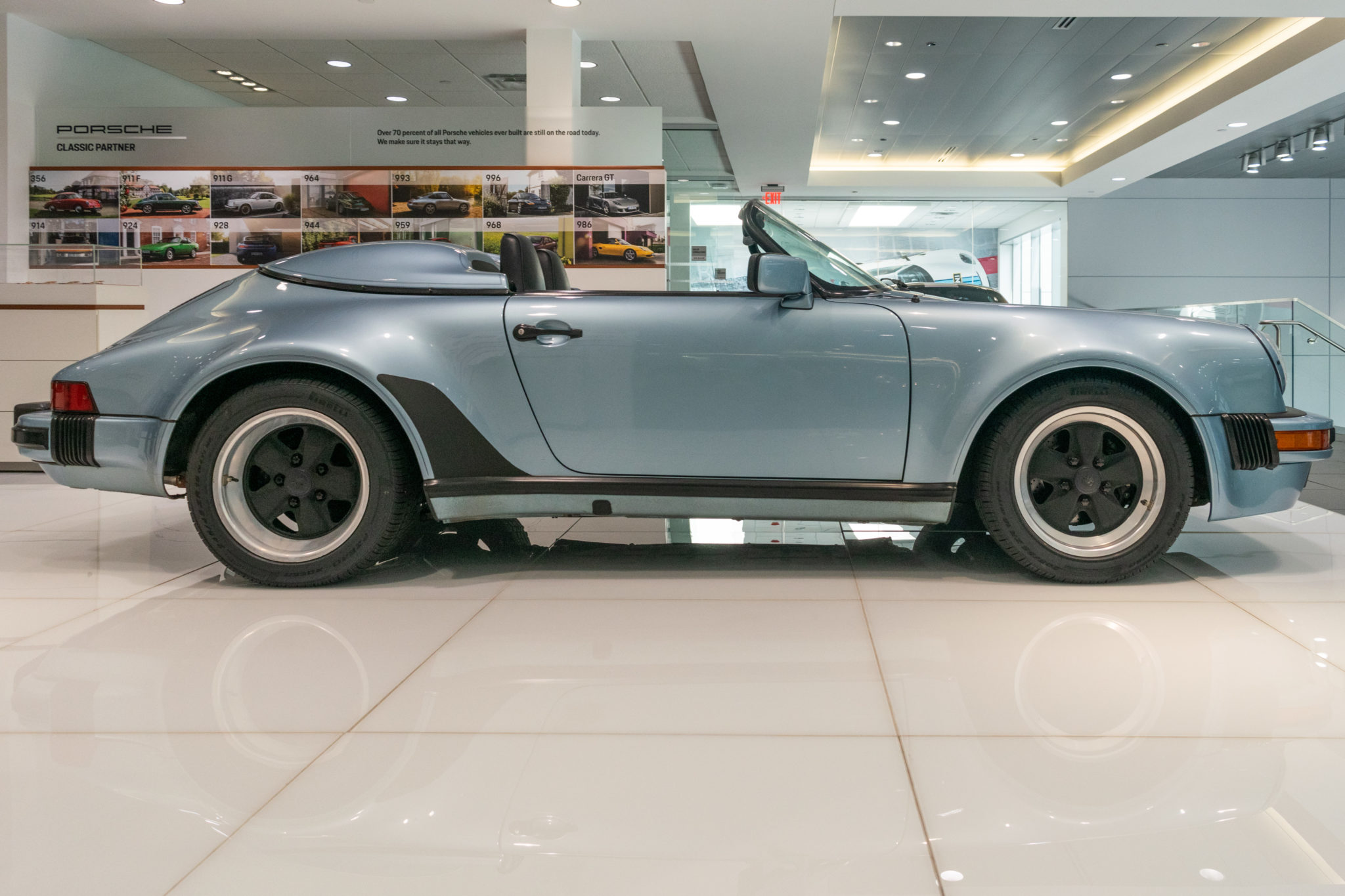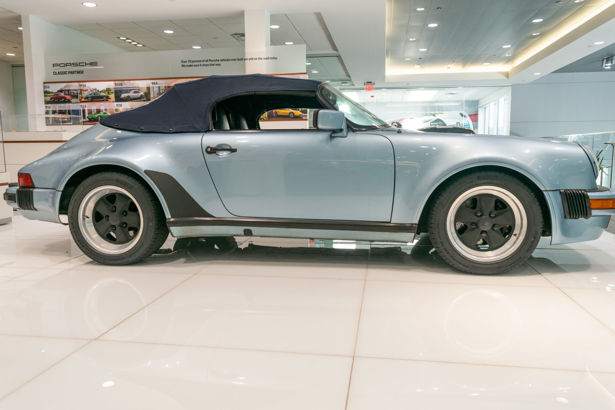 Staggered-width 16″ Fuchs wheels wear Pirelli N Specification tires that were fitted in December 2019. Suspension and brakes are shared with the contemporary Turbo model, and new shocks were installed in 2020. A body-colored, double-bubble fiberglass hard cover conceals the dark blue soft top when it is folded.