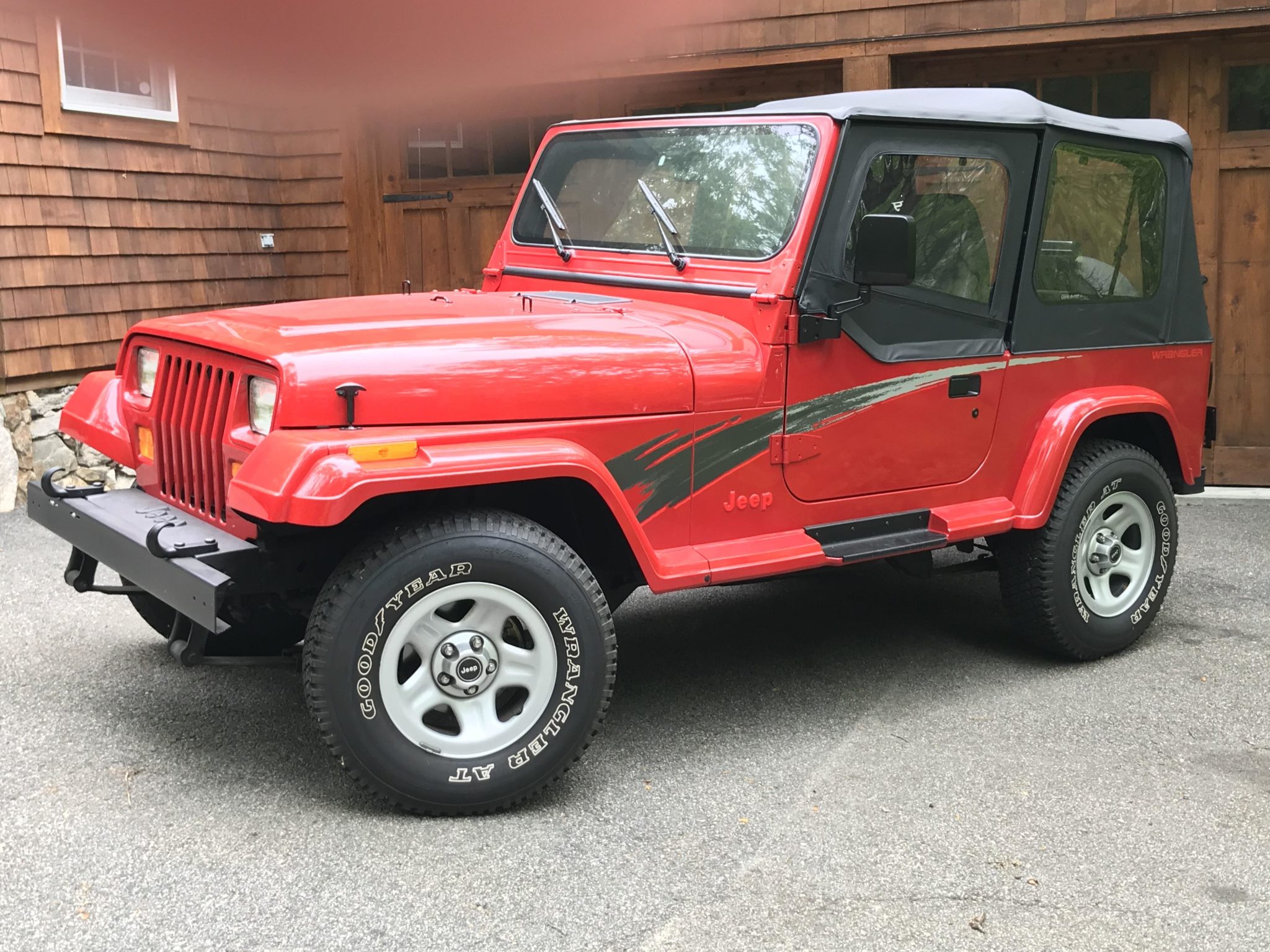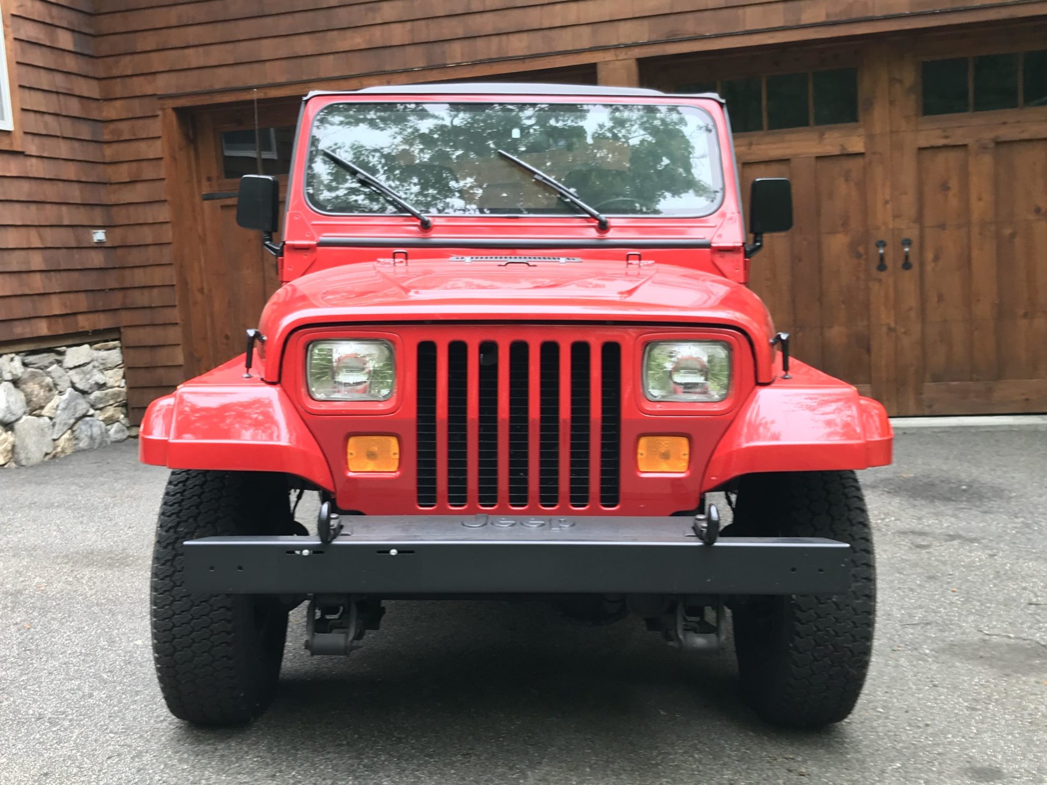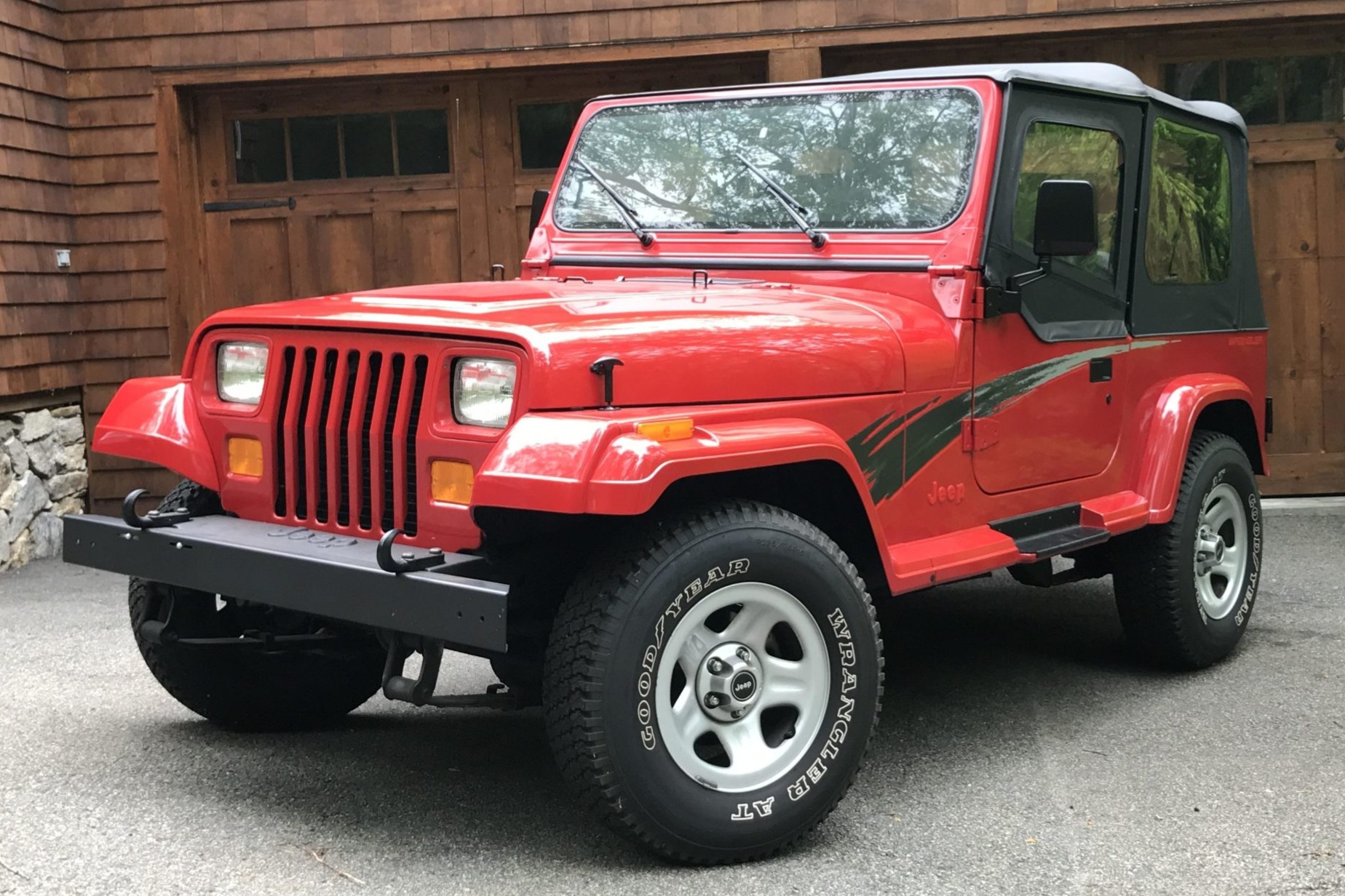 Five-spoke 15″ wheels are wrapped in Goodyear Wrangler all-terrain tires with raised white lettering, and a spare tire is mounted on the swing-away rear carrier. Braking is handled by front discs and rear drums.