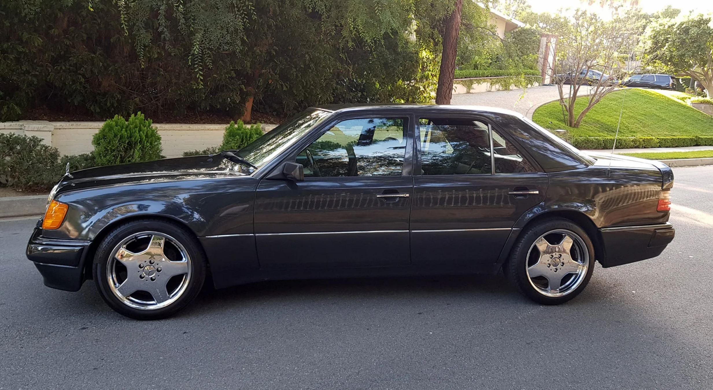 Chromed 18″ AMG Monoblock wheels wear 235/45 Michelin Energy tires on the front and 245/40 Nankang tires out back. Distinguishing features of the 500E versus other W124 models included a wider track width, flared fender arches, larger four-wheel disc brakes, unique lower body cladding, and a more aggressive front air dam.