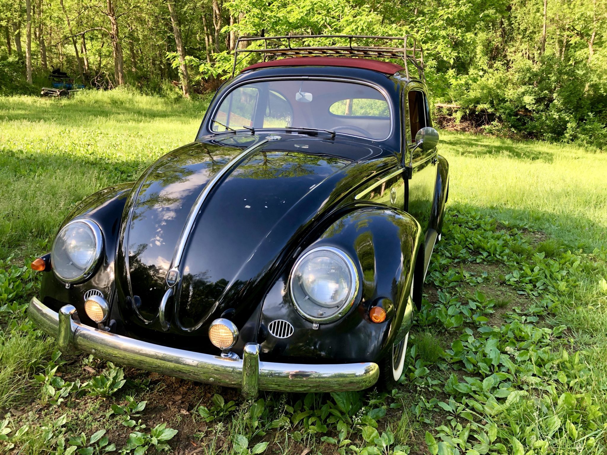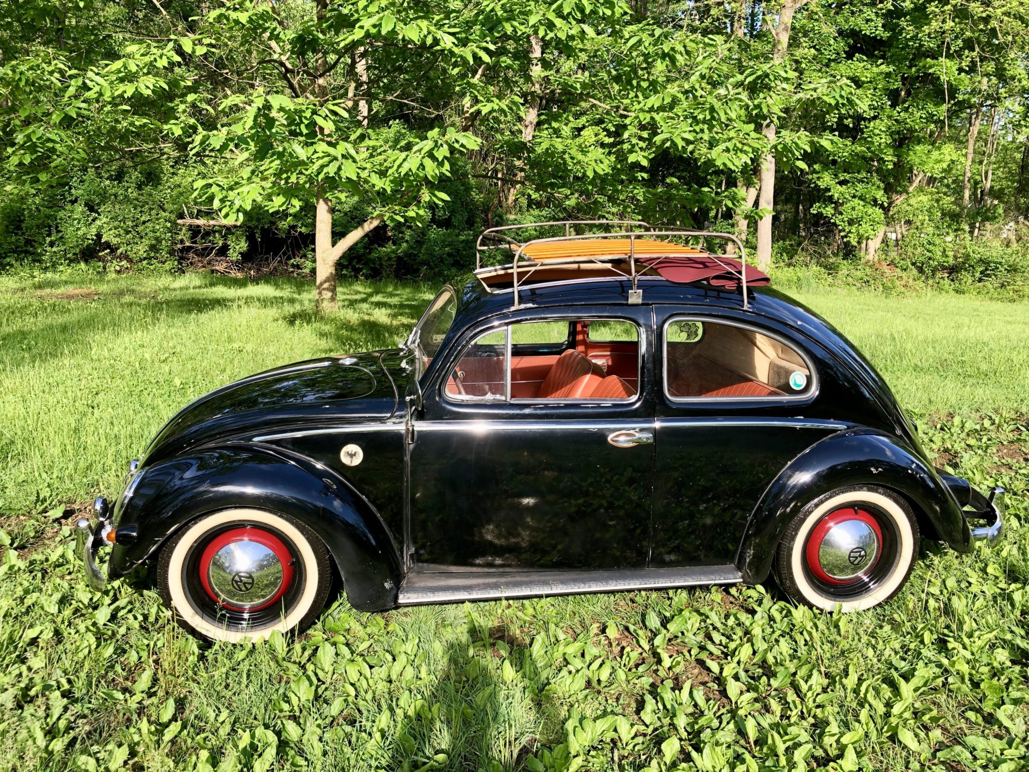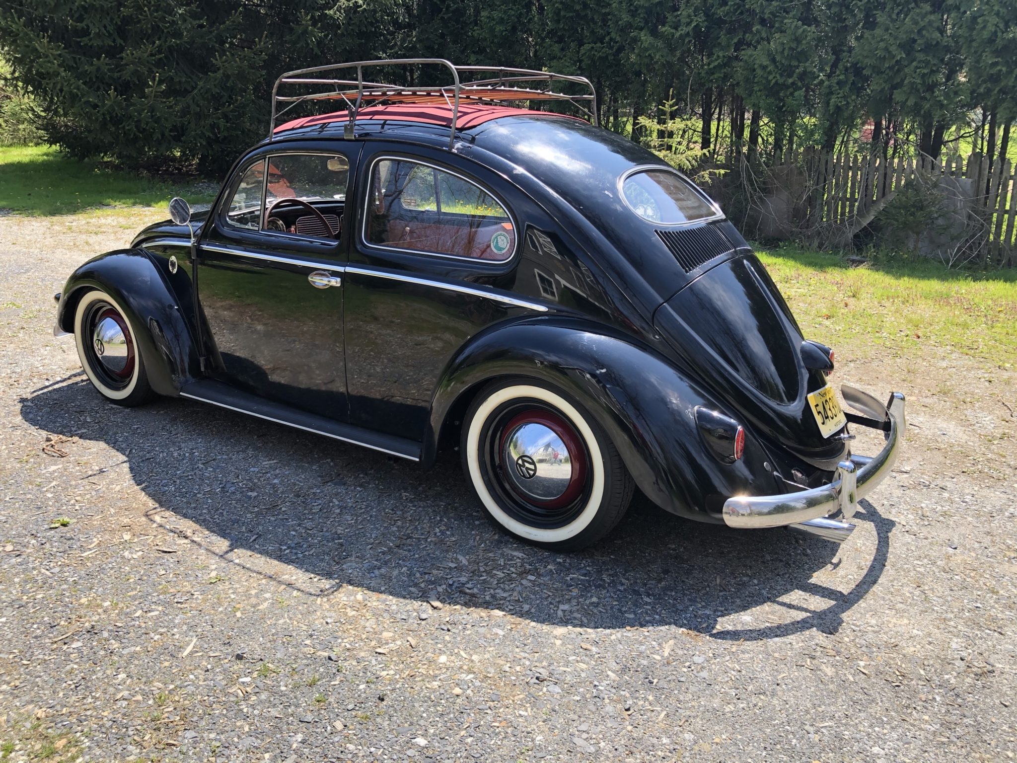 Black and red-painted steel wheels wear chrome hubcaps and are wrapped in radial whitewall tires. A 2” narrowed front beam with 2” drop spindles has been added, along with rear wheel spacers from a 356 Carrera. Stopping power is handled by finned Porsche 356 drum brakes, and a replacement master cylinder and brake lines have been installed. A walk-around video can be seen here.