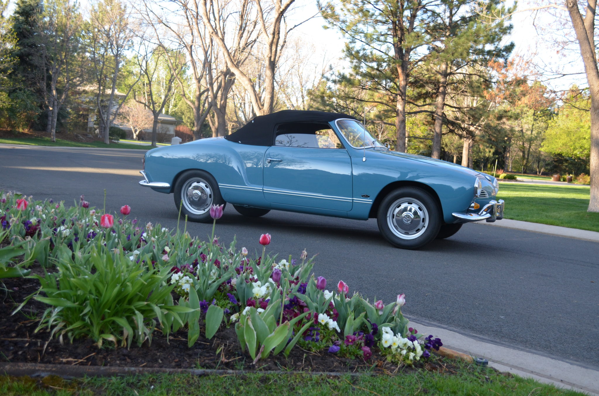 Refinished four-lug steel wheels feature chrome hubcaps and 165R-15 Arizonian radial tires. A refurbished spare is fitted in the trunk. New features for 1967 included a dual-circuit braking system, front disc brakes, and a revised top secured by cable. A replacement black Stayfast canvas top was installed during the refurbishment, and the rear suspension was raised 1″ to accommodate the larger-than-stock tires. New ball joints and shocks were installed in November 2019.