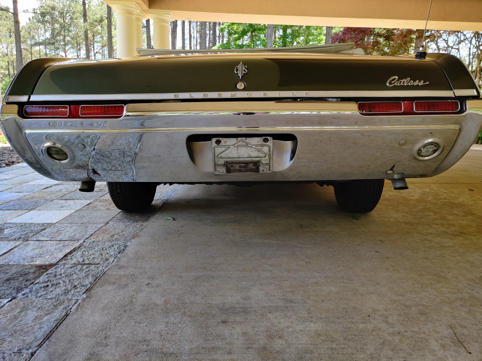 Black 14″ SSII Rally wheels feature polished trim rings and Oldsmobile center caps. Uniroyal whitewall tires measuring 205/75 are fitted at all four corners.