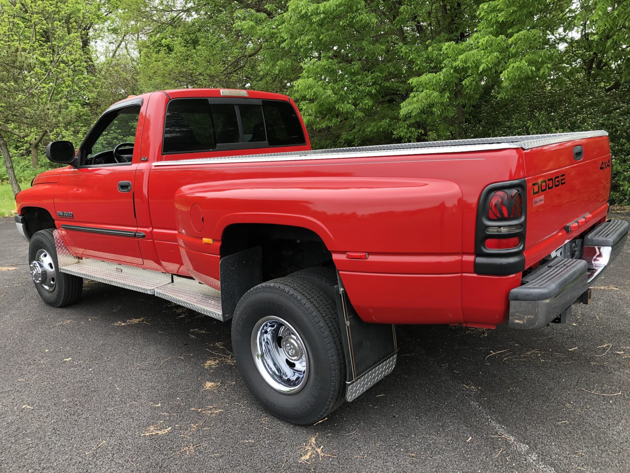 Additional accessories include diamond-plate running boards and bed rail trim, clearance lights, rear mud flaps, taillight covers with Ram logos, window rain guards, and a three-piece bug deflector. Eight-lug chrome 16″ wheels wear Firestone tires that should be replaced due to cracking. The truck was ordered with the Camper Special package including a rear sway bar and auxiliary rear springs.