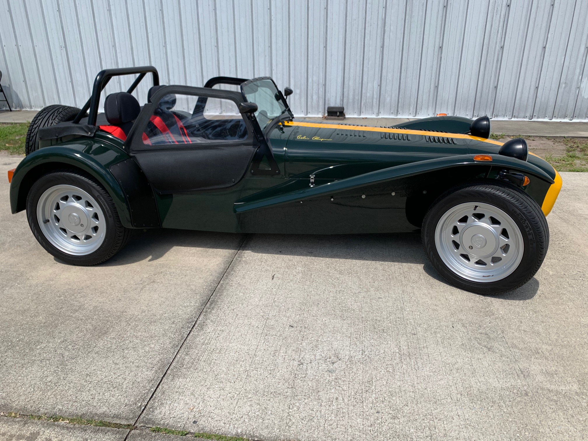15″ Prisoner alloy wheels are fitted with Continental ContiProContact tires measuring 195/50, including a matching rear-mounted spare, and the seller notes that the puzzle key for removing the center caps is included. Braking is handled by four-wheel discs, and the car features independent front suspension with adjustable Bilstein coilover assemblies and a de Dion setup out back.