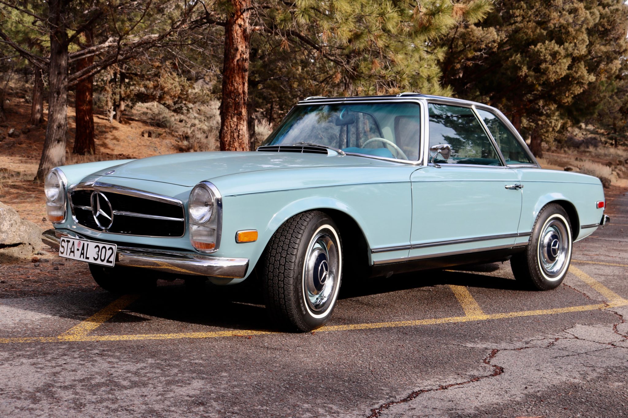 Body-colored 14” steel wheels wear chrome beauty rings and dark blue hubcaps, and are wrapped in Michelin Radial XH tires. Disc brakes are equipped at all four corners.