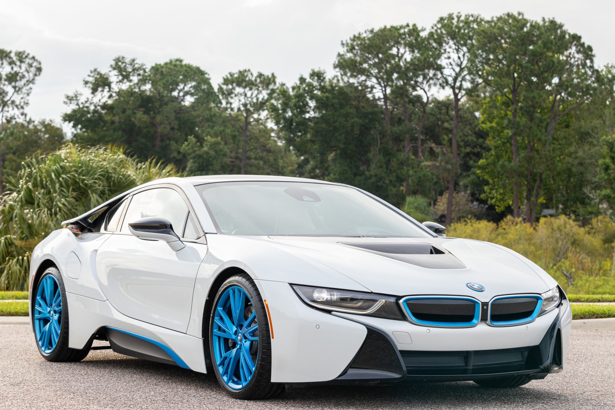 Factory 20″ Style 470 wheels have been powder-coated to match the i8’s blue exterior accents and are wrapped in 245/35 Michelin Pilot Super Sport tires. Brake calipers with i Blue accents and “BMW i” lettering are equipped as part of the Pure Impulse package.