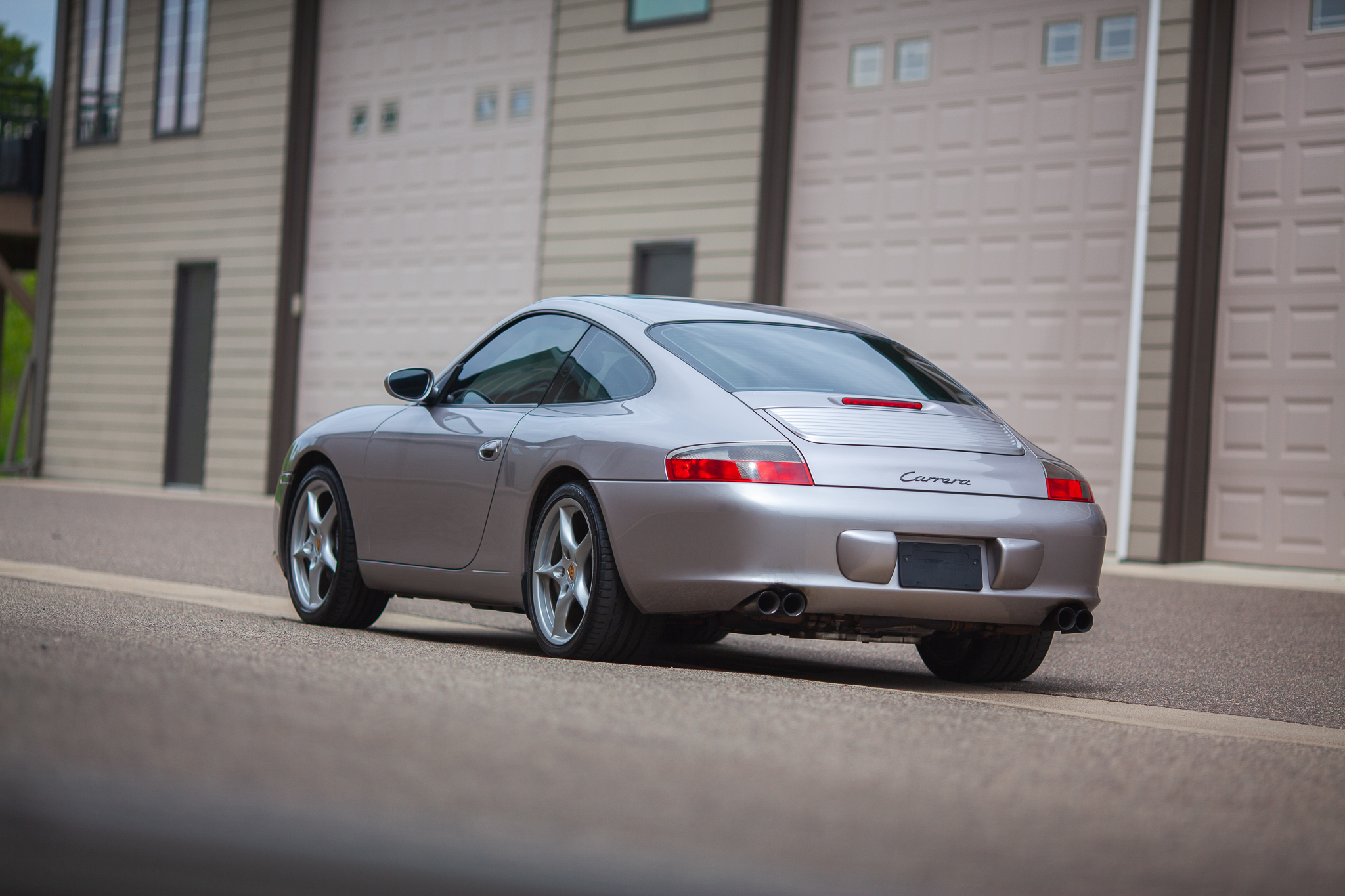 Replacement forged 18″ Carrera wheels wear colored-crest center caps and Bridgestone Potenza S-04 Pole Position tires with 2017 date codes. The seller notes scuffing on the wheels. Aftermarket front and rear sway bars have been fitted along with Hawk HPS 5.0 brake pads.