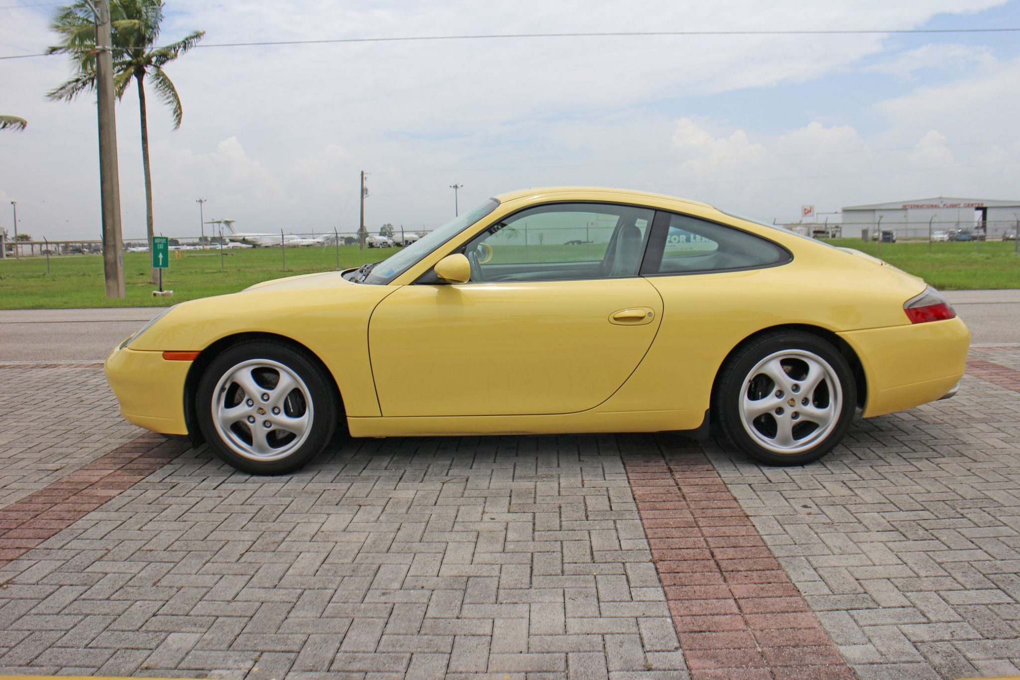 Factory 17″ wheels wear colored Porsche crest center caps and Sumitomo HTR A/S P01 tires. Curb rash is visible on the left rear wheel.