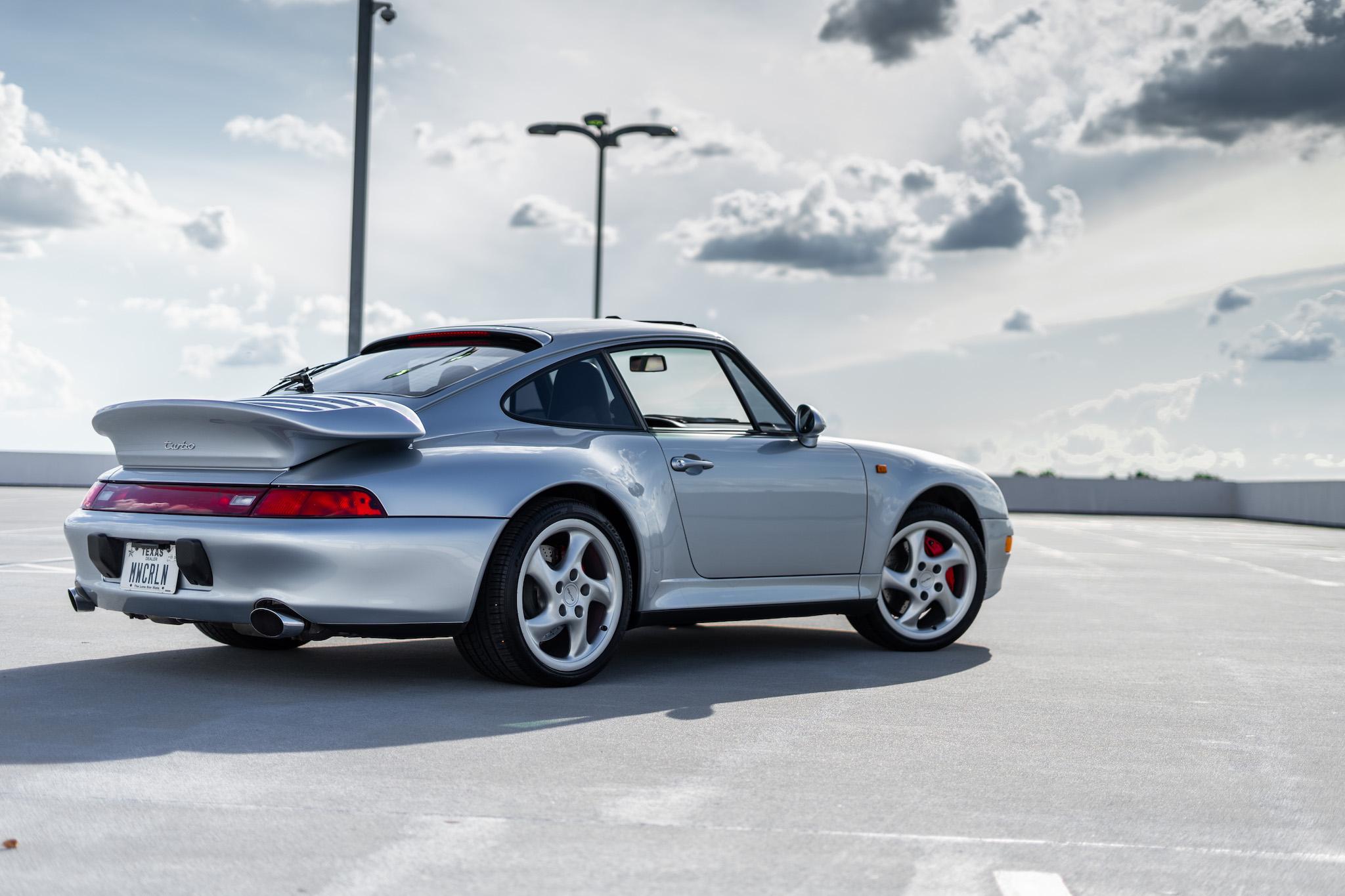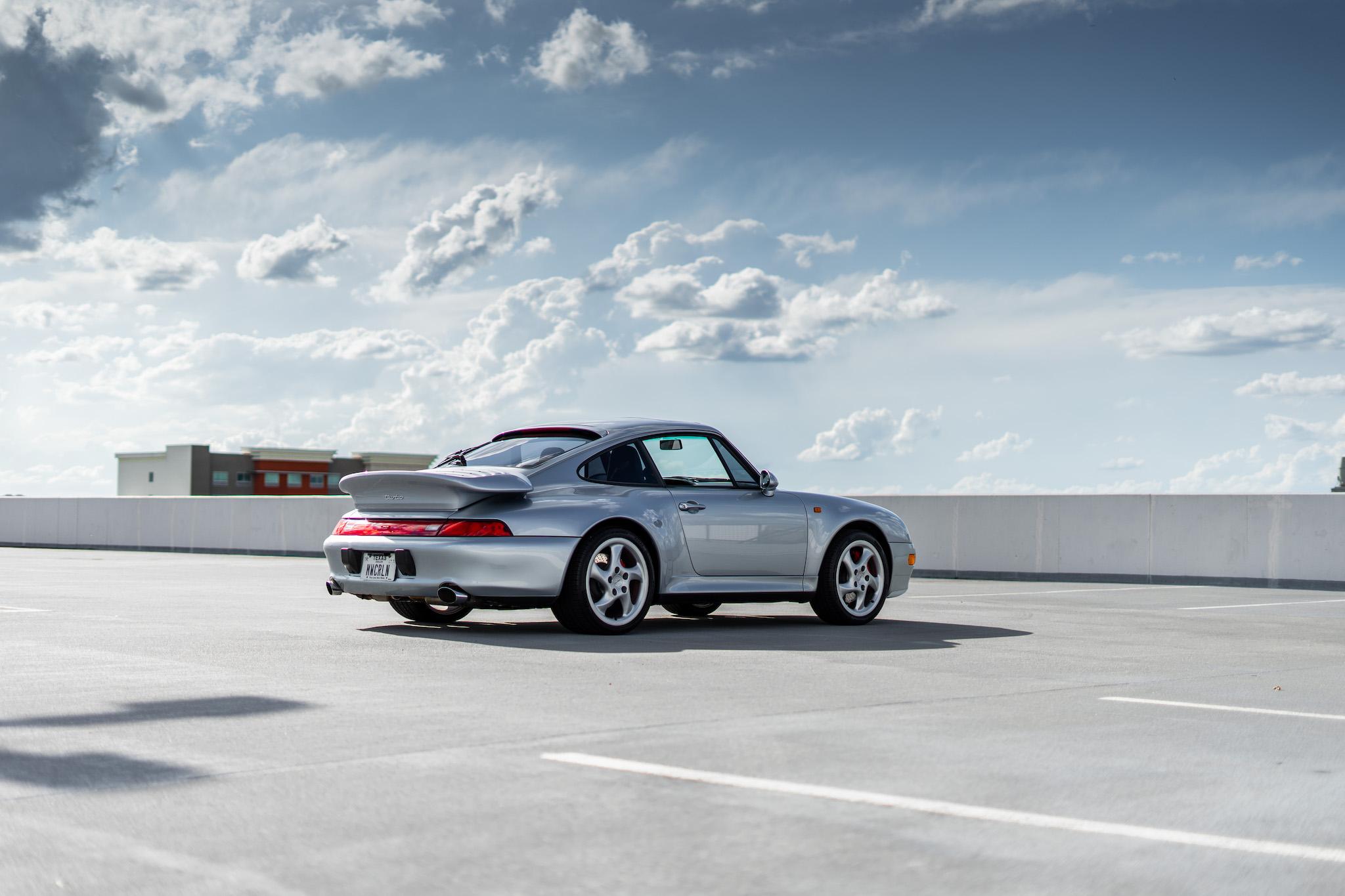 Factory 18″ wheels wear Turbo center caps and Pirelli P Zero Rosso tires from 2015 that are sized 225/40 up front and 285/30 out back. The 993 Turbo came standard with red four-piston brake calipers over cross-drilled and vented rotors.