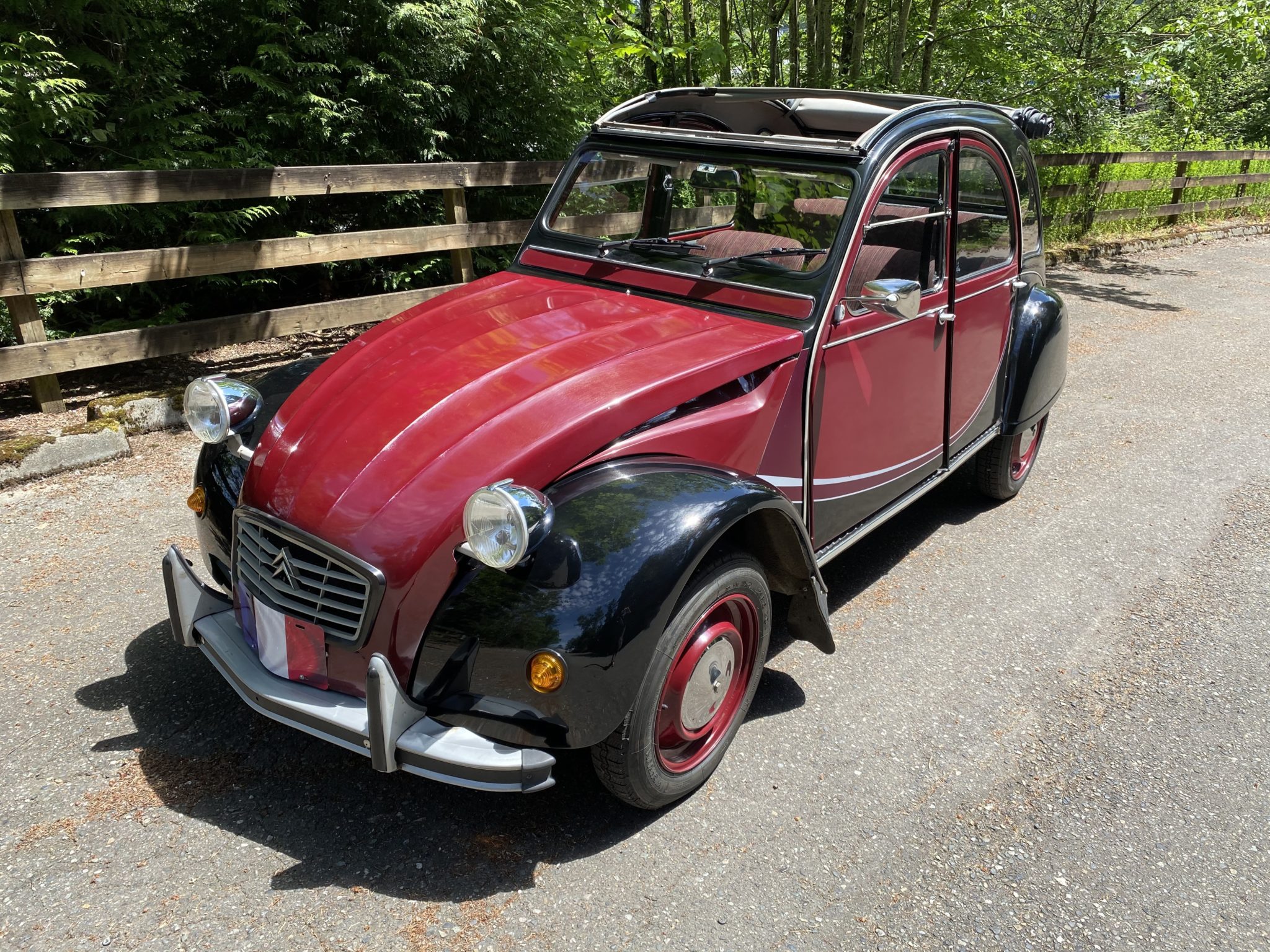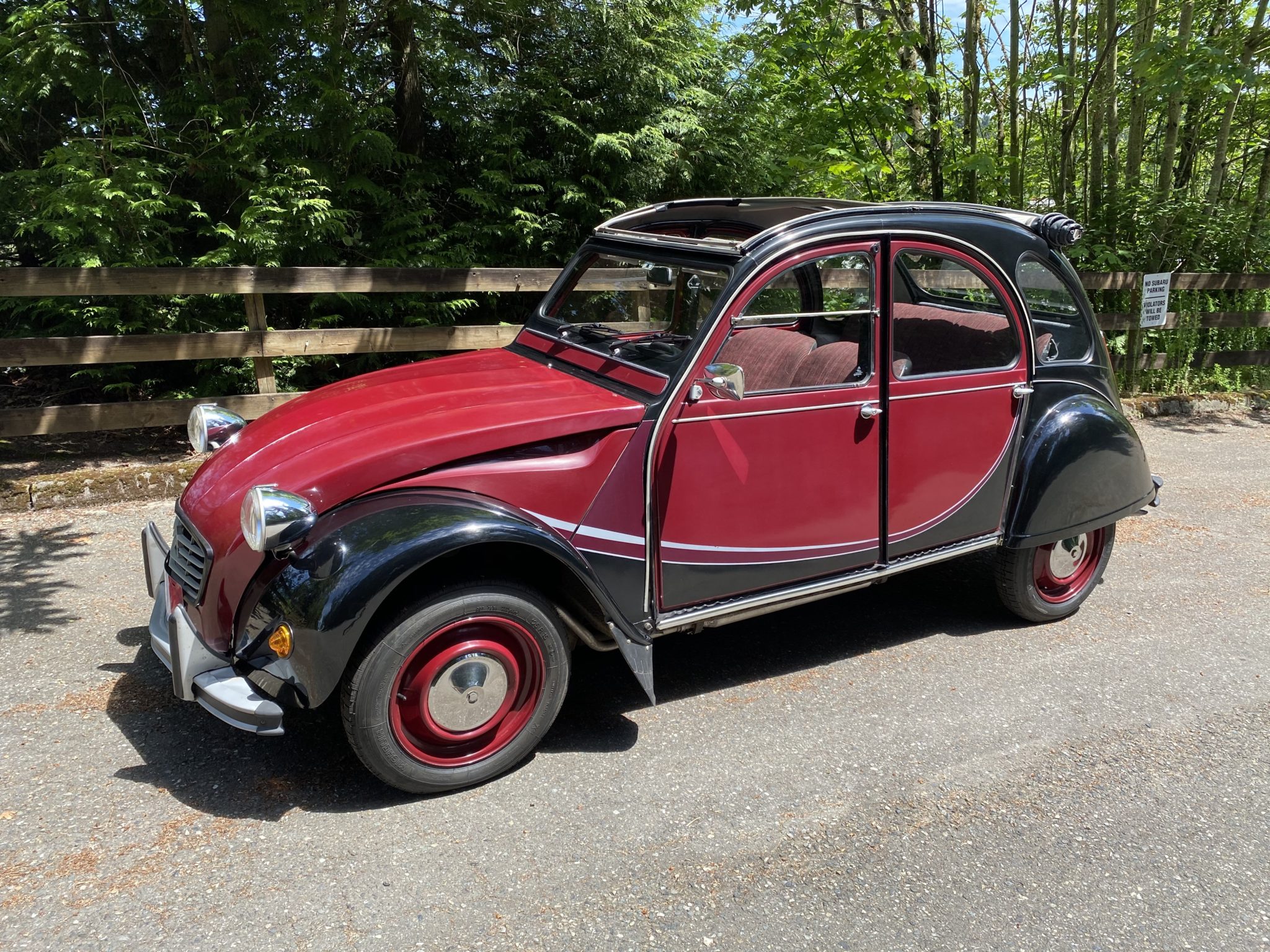 Burgundy 15″ steel wheels wear chrome hubcaps, and Michelin tires measuring 125×15″ have been fitted by the seller. Recent service included bleeding the brake system and adjusting the rear brakes.