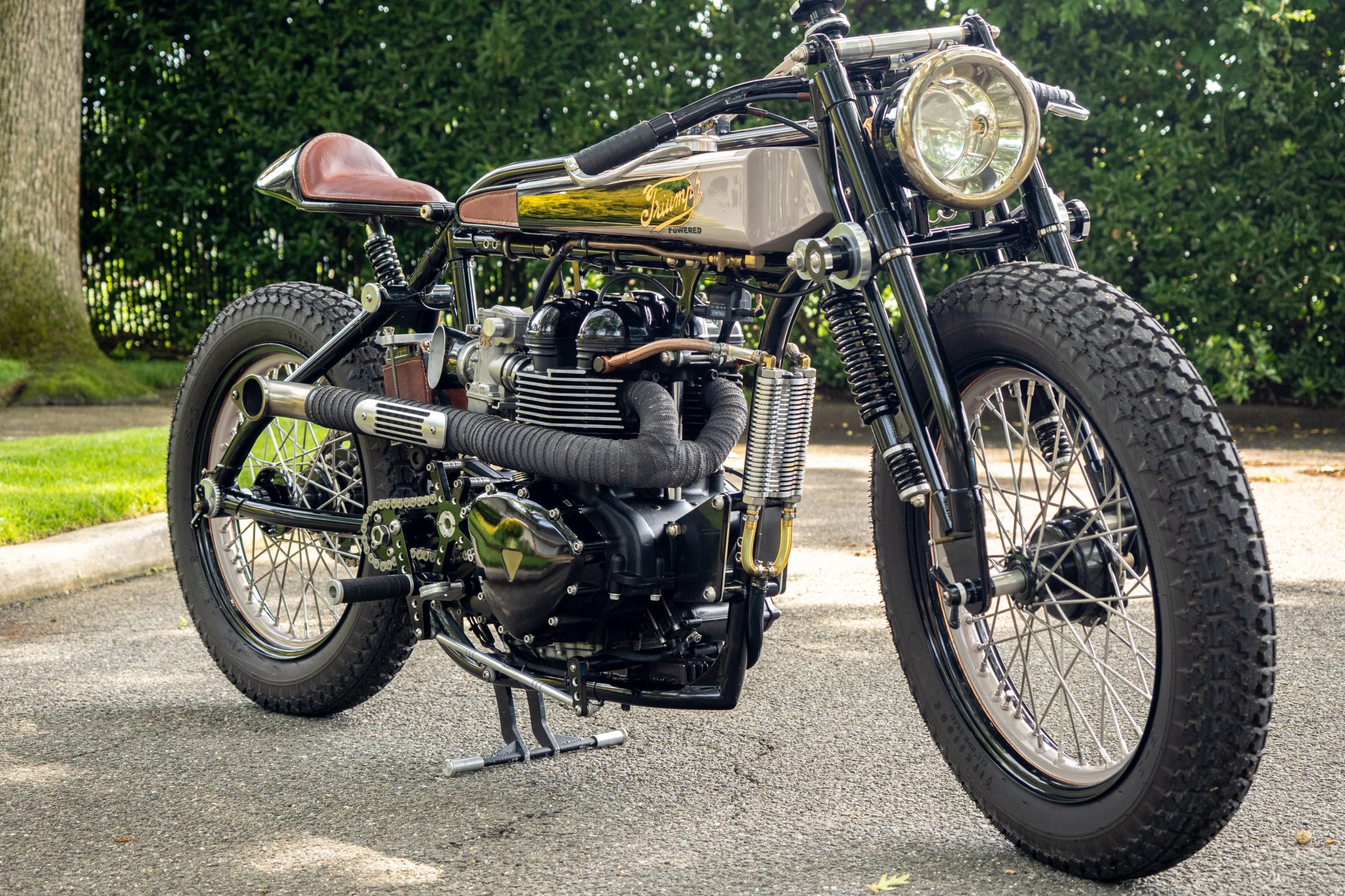 Painted 19″ wire-spoke wheels wear 4.00″ Firestone tires. Suspension consists of a druid-type girder front fork and a single shock supporting the seat in the rear. A conical mini-drum brake provides stopping power up front, while the rear brake is mounted to a jackshaft that also houses a left-side drive sprocket.