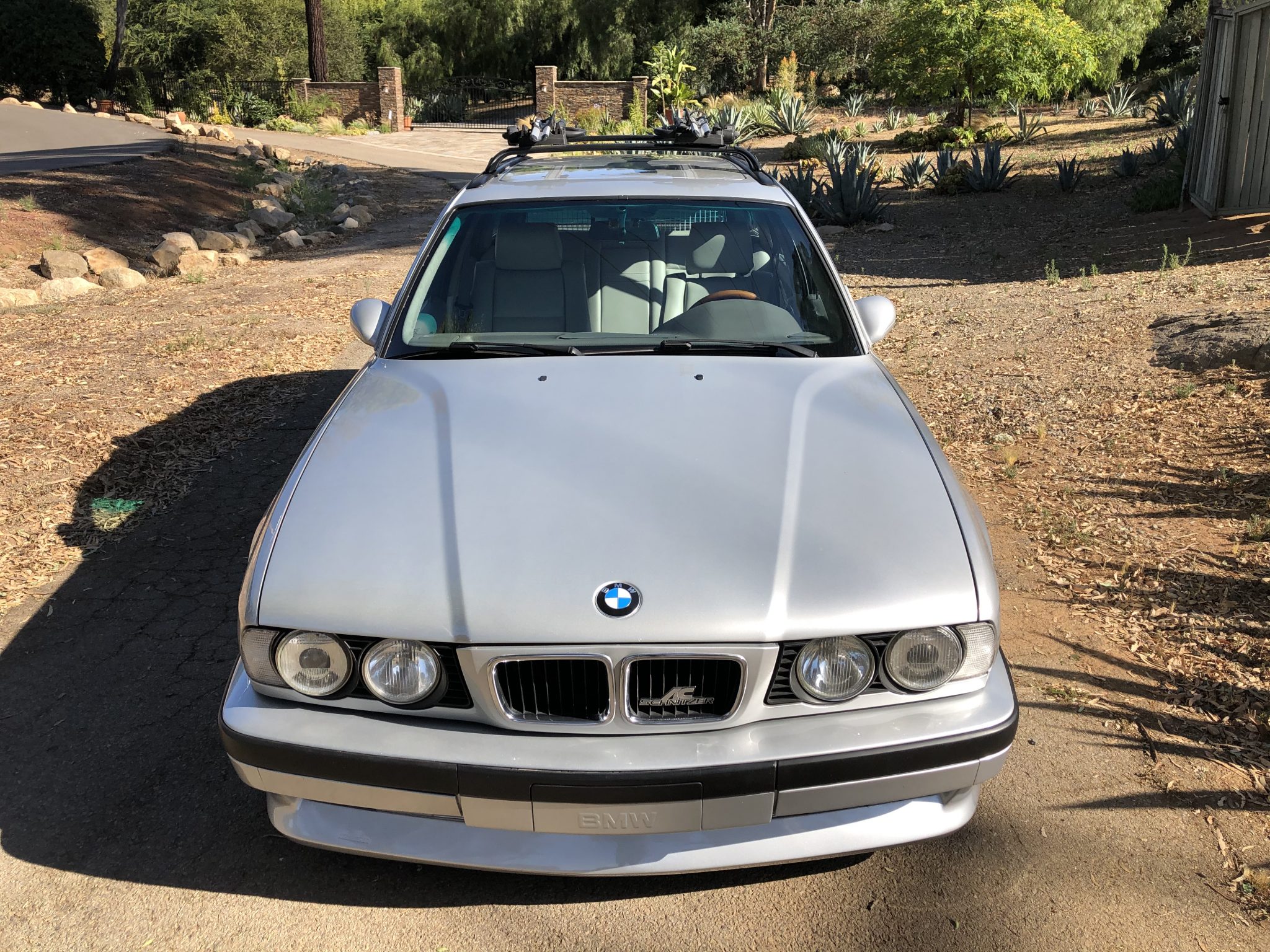 Three-piece 17″ AC Schnitzer Type I wheels were reportedly rebuilt with custom barrels, and 245/45 front and 275/40 rear Nitto NT555 tires were recently mounted. A 17″ M System spare wheel and tire is also included and stored in the cargo area. The braking system was modified with an Angry Ass Solutions F30 big brake kit with cross-drilled 340mm front rotors paired with four-piston Brembo calipers up front. The suspension has been overhauled with CAtuned coilovers and camber plates, AKG Motorsport bump-steer correction plates, Energy Suspension subframe bushings, and replacement differential bushings, control arms, tie rods, and thrust arms.