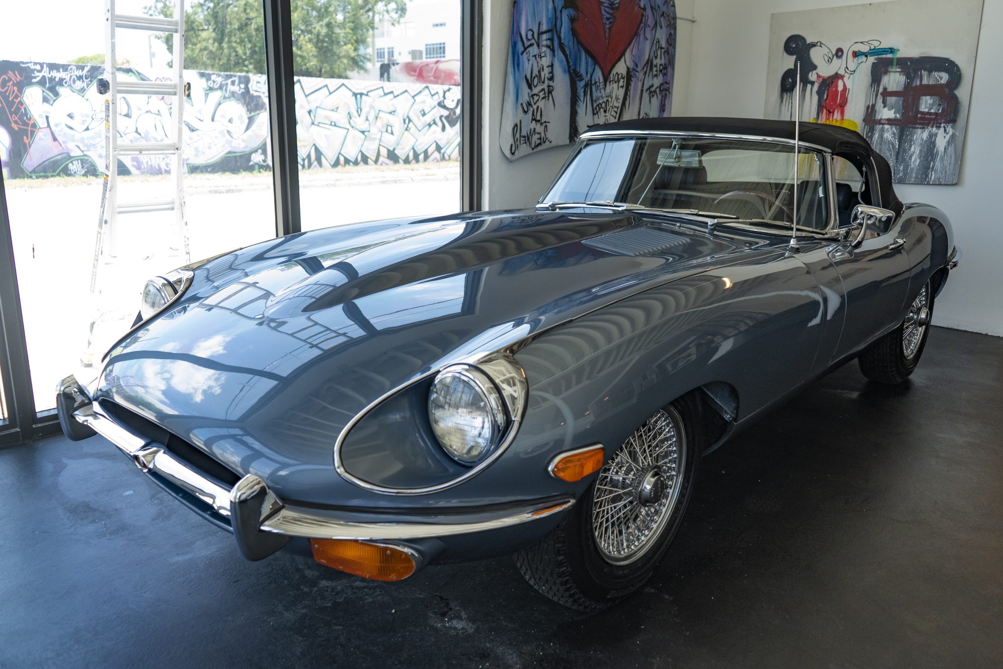 The black convertible top includes a matching soft boot. Dual chrome outside mirrors are fitted, as are chrome wire wheels with knock-off hubs and radial tires.